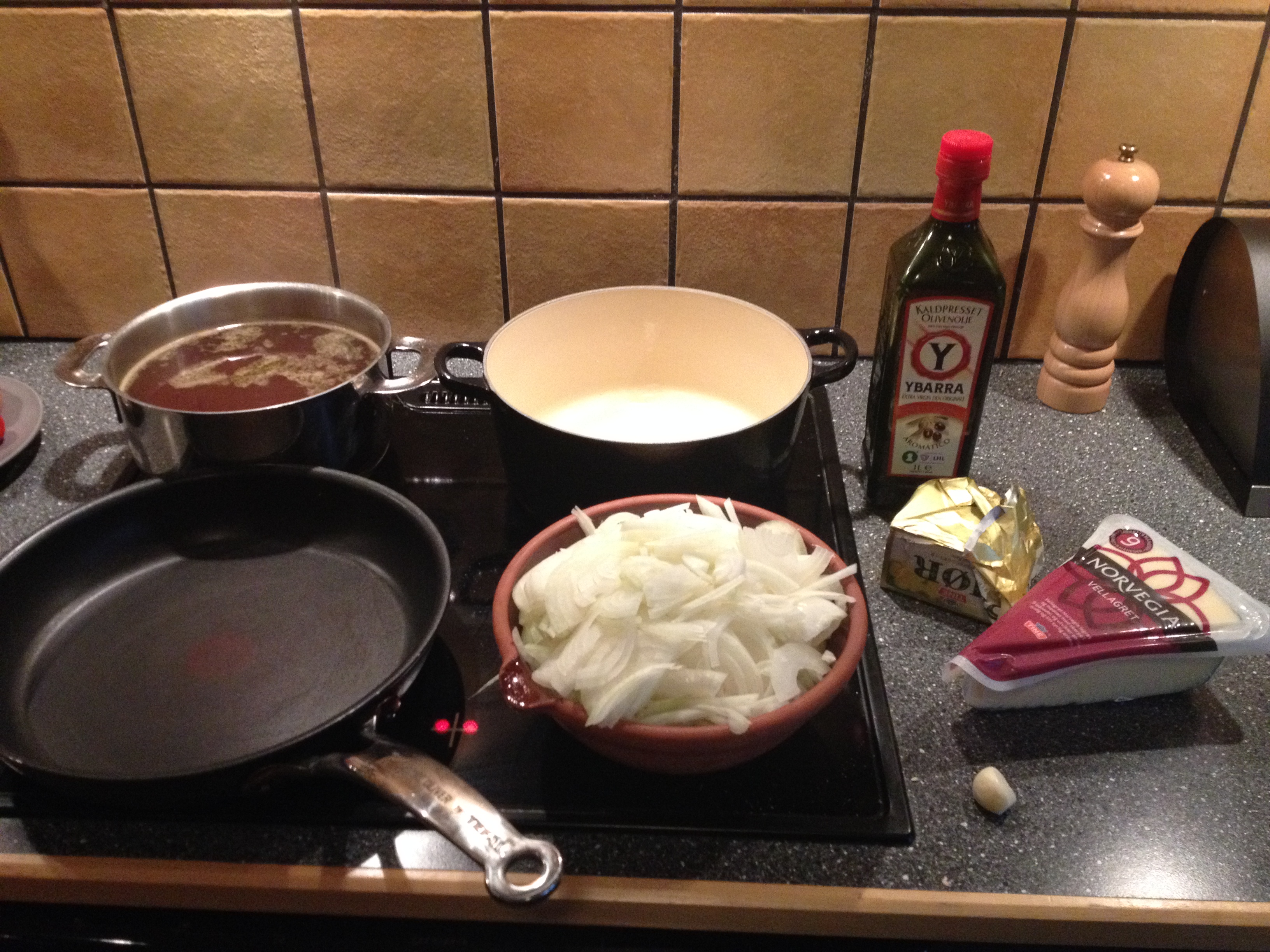 - All løken samles i jerngryta og buljongen helles over, la koke i minst 15 minutter.