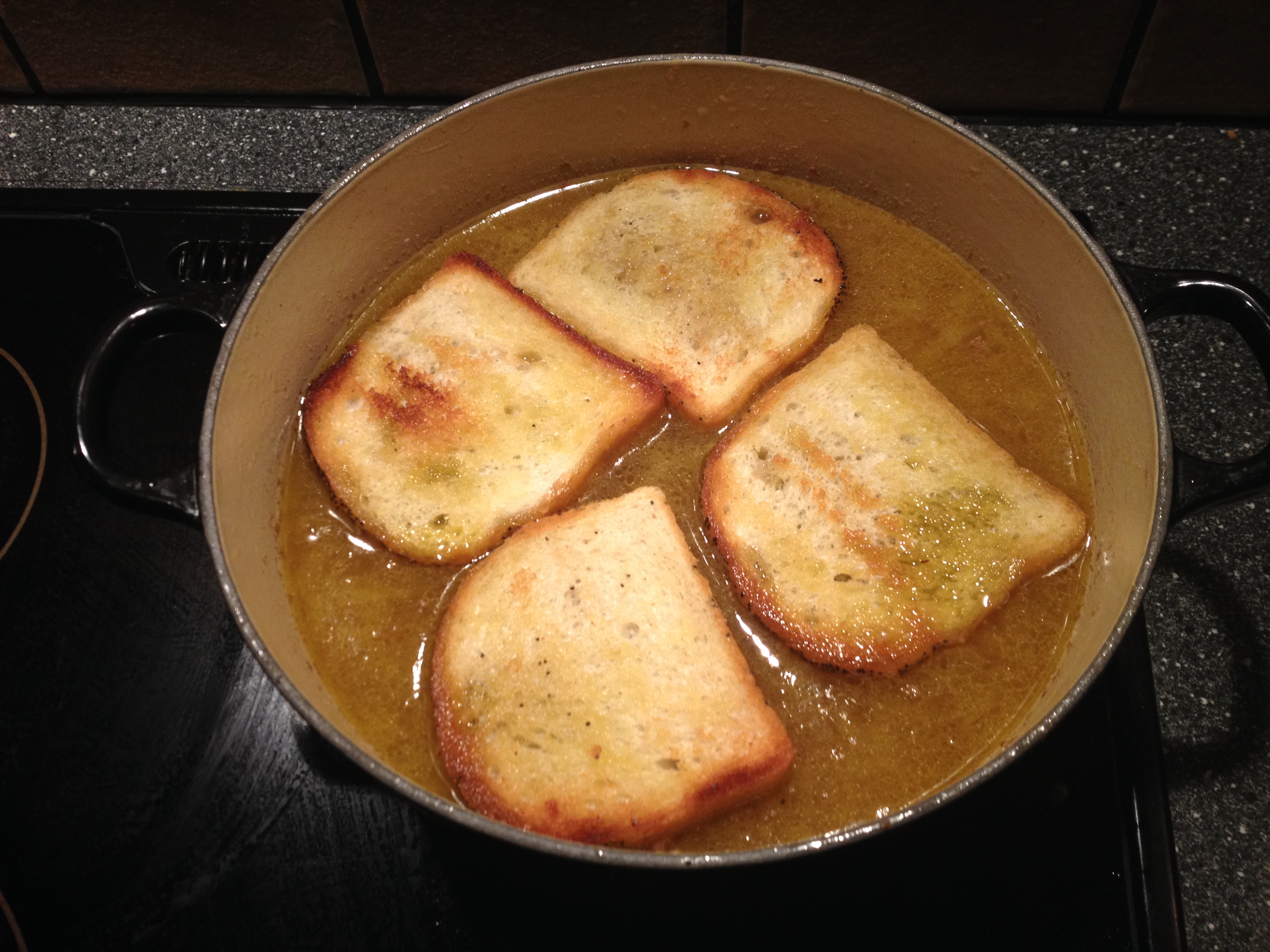 - Mens suppa koker tar du en loffskive per person som du gnir ned i en tallerken med olivenolje slik at sidene blir mettet med olje. Skivene steker i stekepanne – følg med, de skal bli gylden, men ikke brent. Legg de til side.