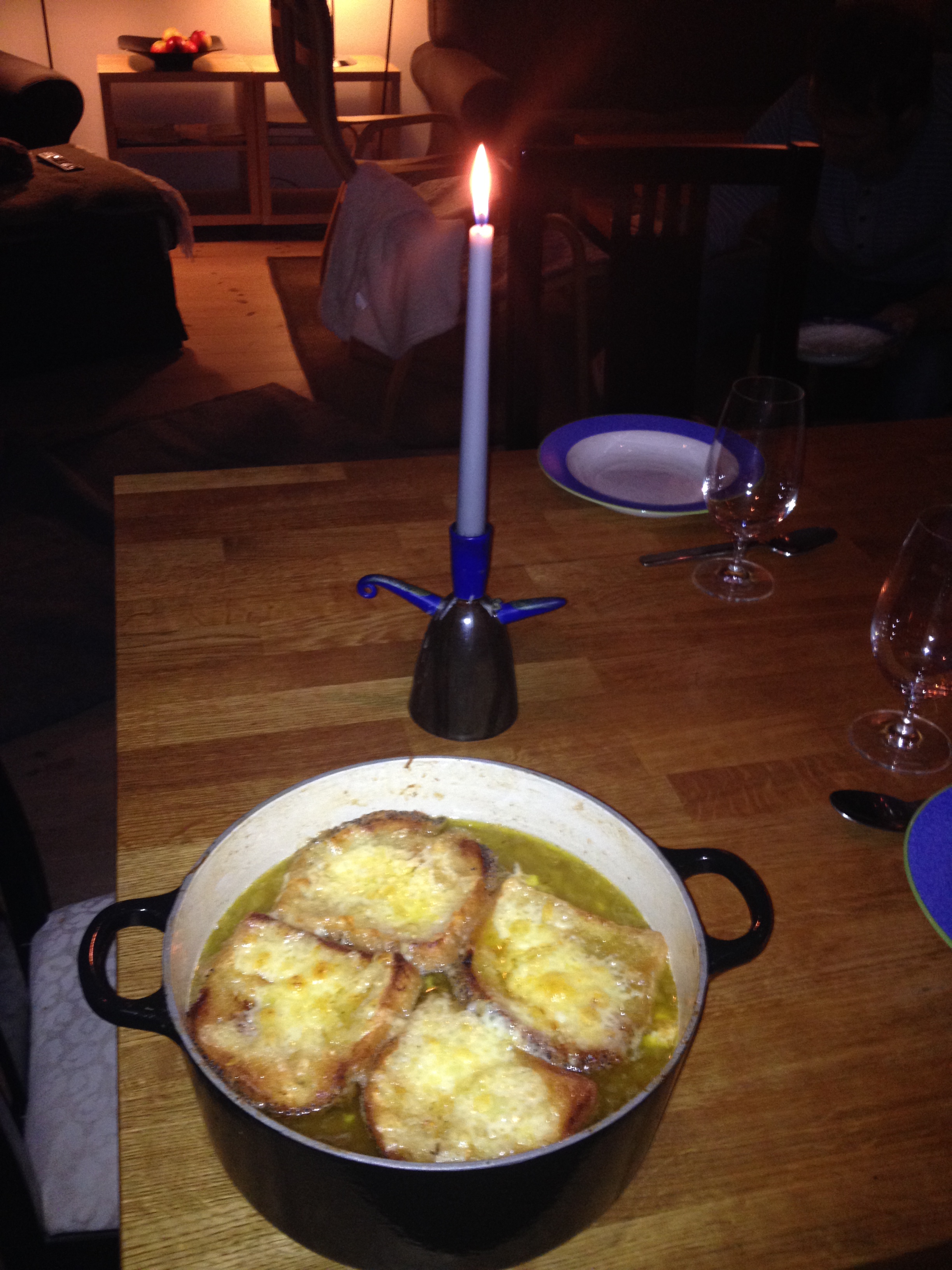 med hvitløk oppå. Hele gryta går inn i den varme stekovnen – høyest mulig slik at osten gratineres og får litt gyldenhet. Etter kanskje 5 minutter – pass på! – er suppa sikkert klar for servering.