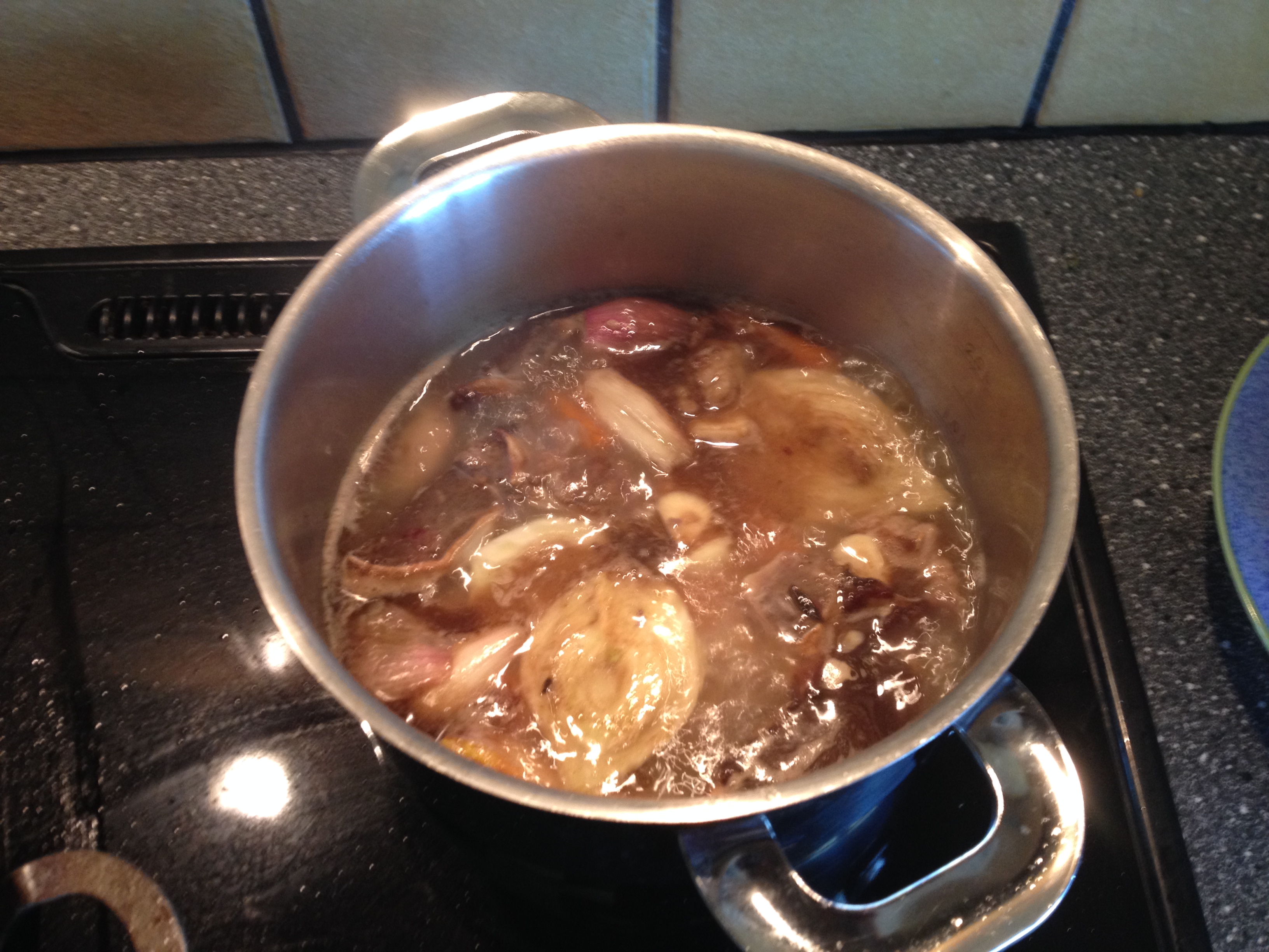 å vente til slutten med å tilsette sjalottløk, bacon og sopp. Og gjerne å koke egen kraft ved å kjøpe kjøtt med godt med bein (Eller kjøpe litt ekstra kraftbein). Her er krafta i koking: Oppdelte bein, gulerot, løk, fenikkel og pepperkorn.