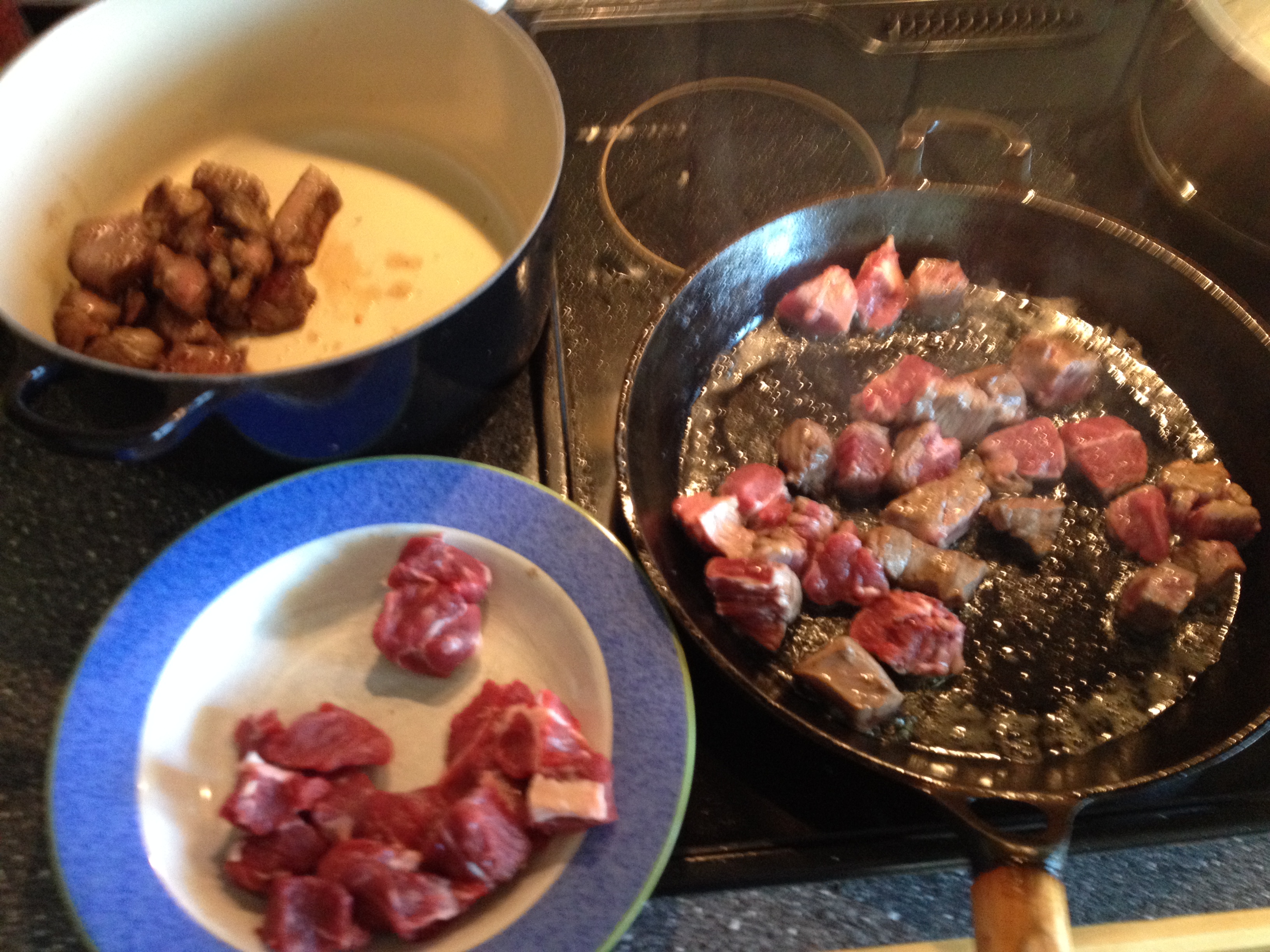 - Jeg velger okse høyrygg som kjøtt, ca 1 kg, kuttes i grove terninger 2-3 cm og brunstekes i panna. Vær raus med olje