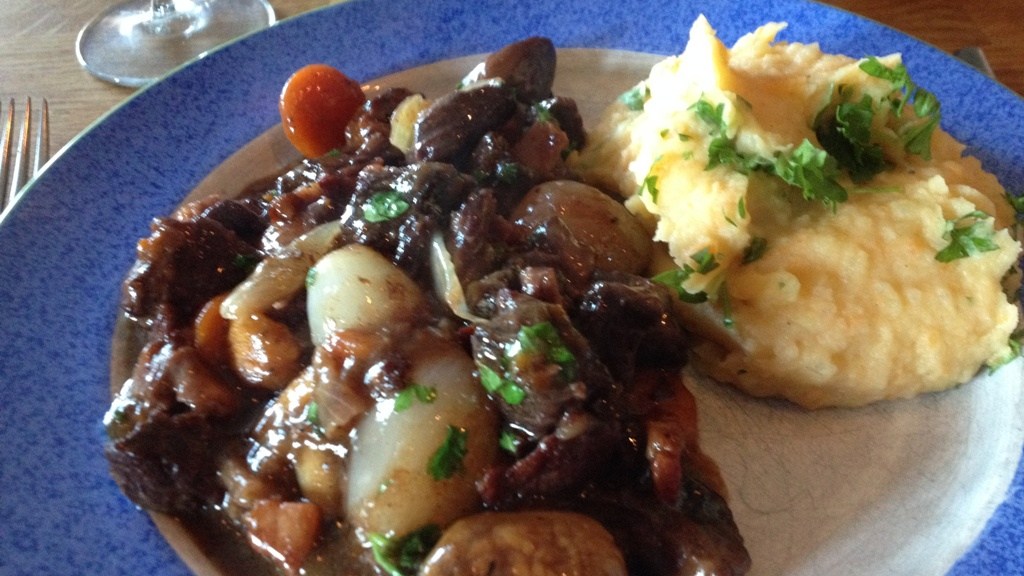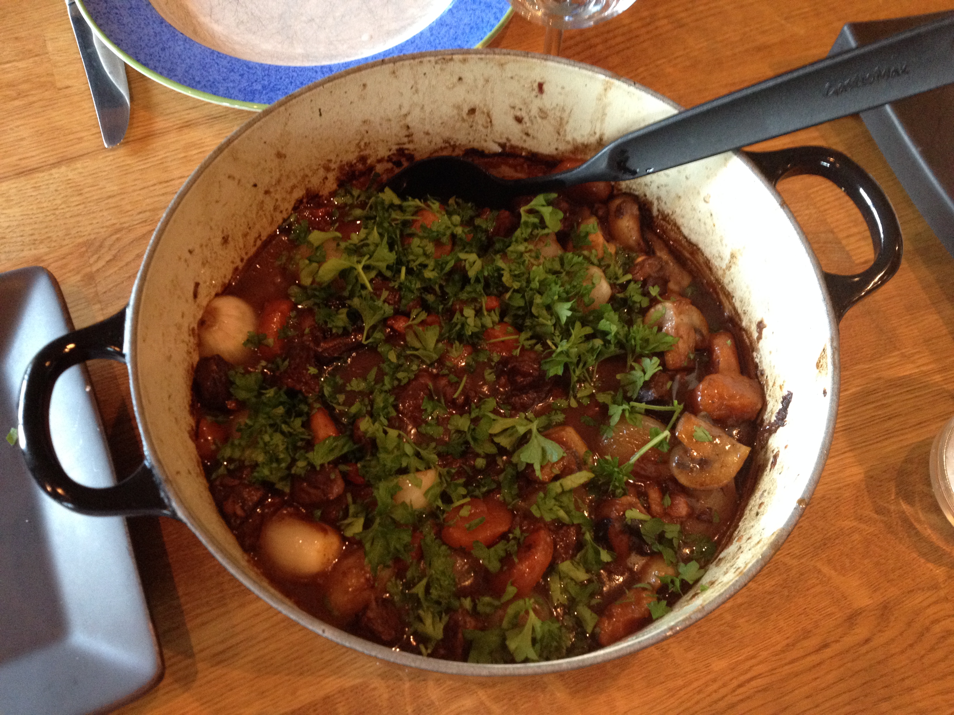 til med salt og pepper. Tøm væska tilbake i gryta og alt røres forsiktig sammen. Dryss over med persille, da er boeuf bourguignon klar til servering! I dag har den følge av en rotmos. Og i glasset? Fransk må det vel være, men kanskje en bra Cote du Rohne er greiere for lommeboka enn en topp Burgund…..