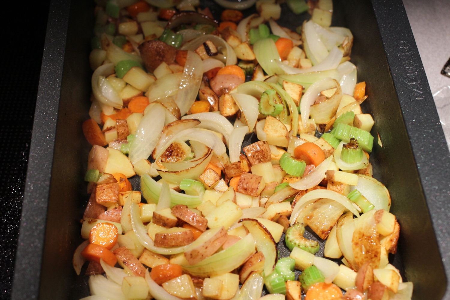 - Ta 2-3 poteter, en gulerot og 1/2 løk per person og skjær i terninger, skiver og båter. Har du andre grønnsaker/rotfrukter så prøv gjerne det. Surr alt i stekepanne slik at det blir lett brunstekt.