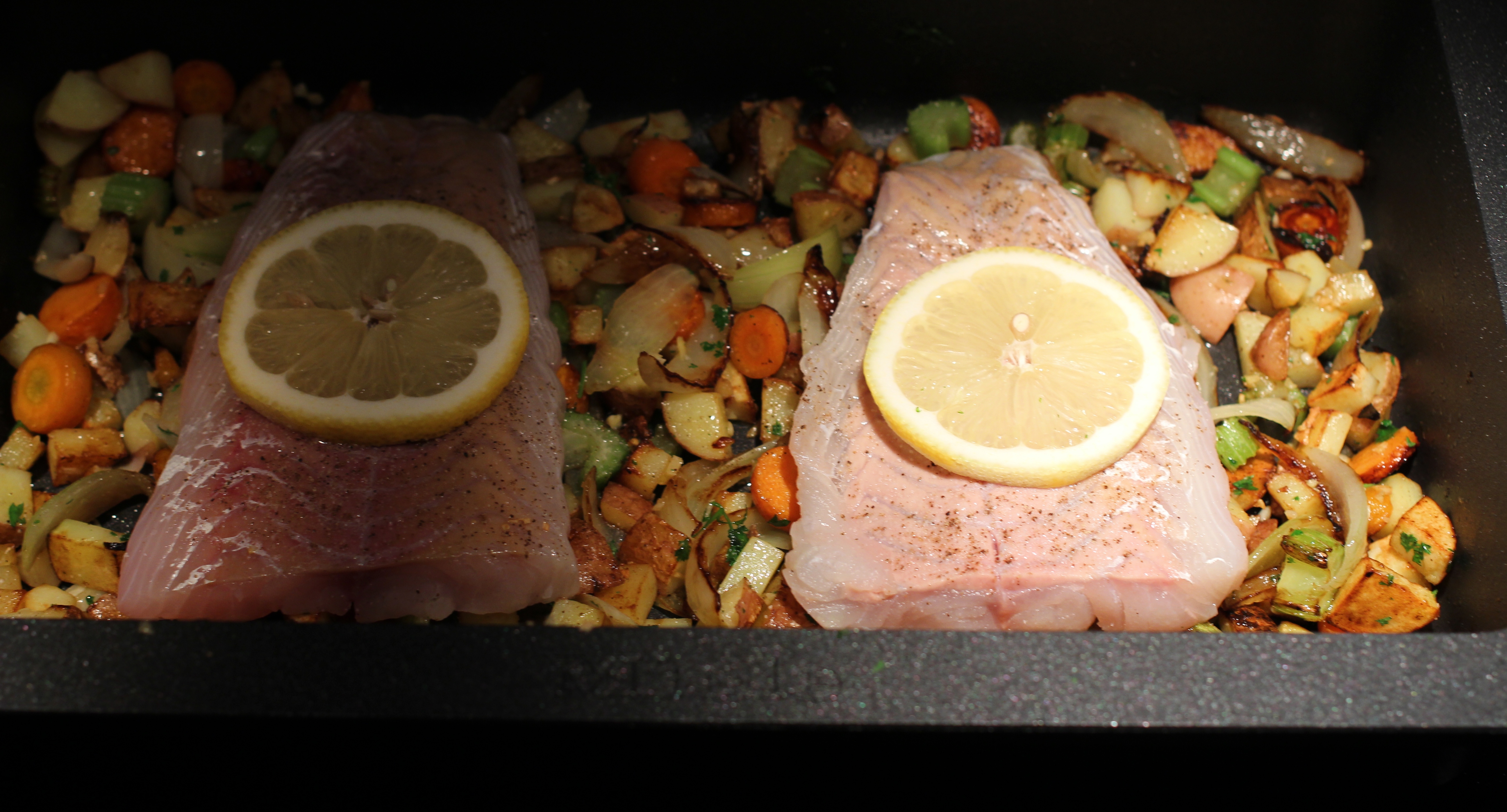 legg ei sitronskive over. - Så går hele greia inn i stekovnen i ca 10 minutter på 180 °C, har du dampovn, så gjør som meg – dampkok i 10 minutt. Seien skal være saftig og ikke bli tørr.