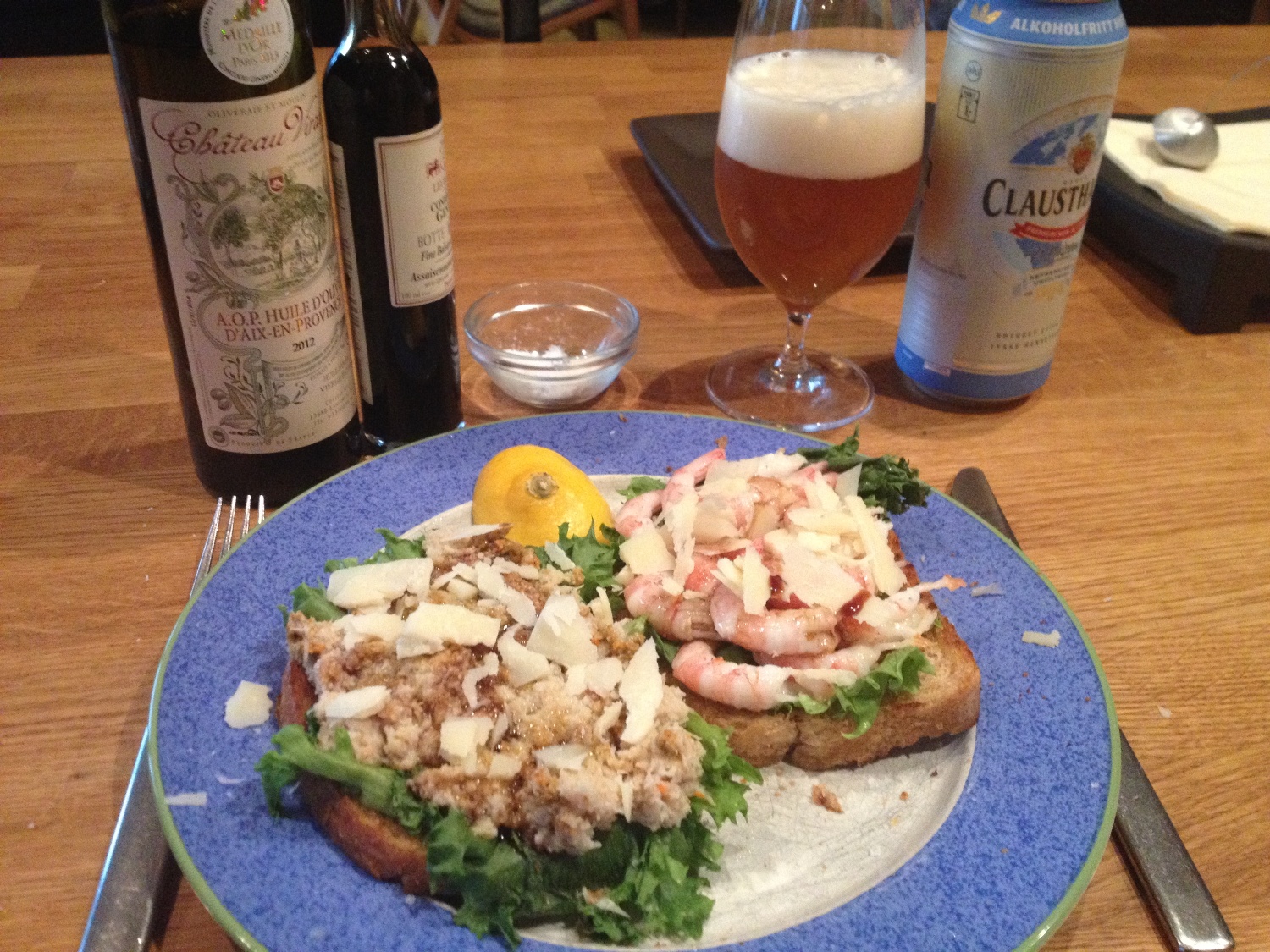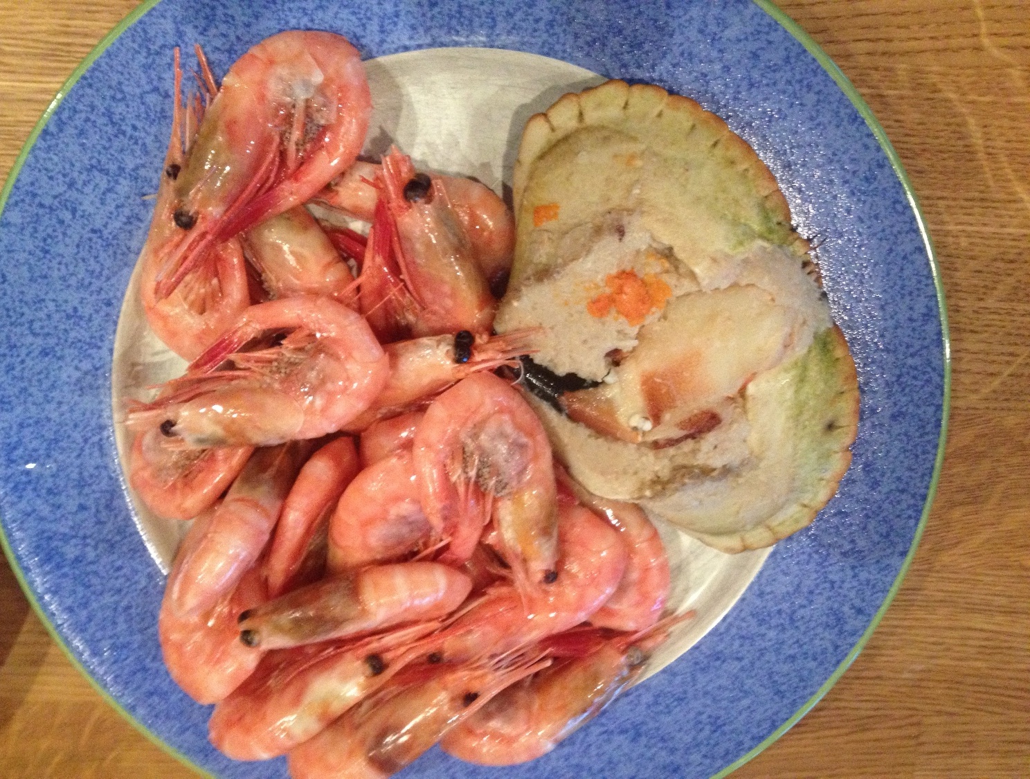 Denne gangen hadde jeg mye gammelt grovt brød, og når jeg på vegen hjem passerte en mulighet for å kjøpe krabbe og reker, lot jeg meg friste til en skalldyrvariant: