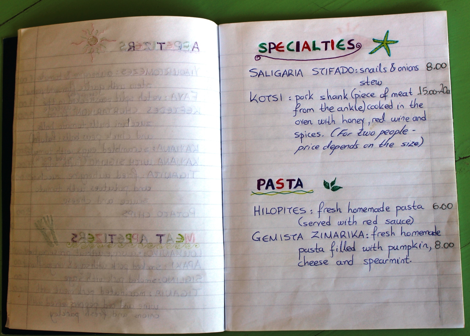 Menyen var håndskrevet i ei ”skolebok”, og jeg og Grete valgte Kotsi: Griseskank kokt i rødvin og honning. Retten så fantastisk ut når den kom, og etter første smak blir det sagt at jeg brukte et ganske sjeldent uttrykk til meg å være: ”Åh, gode gud i himmelen!!”