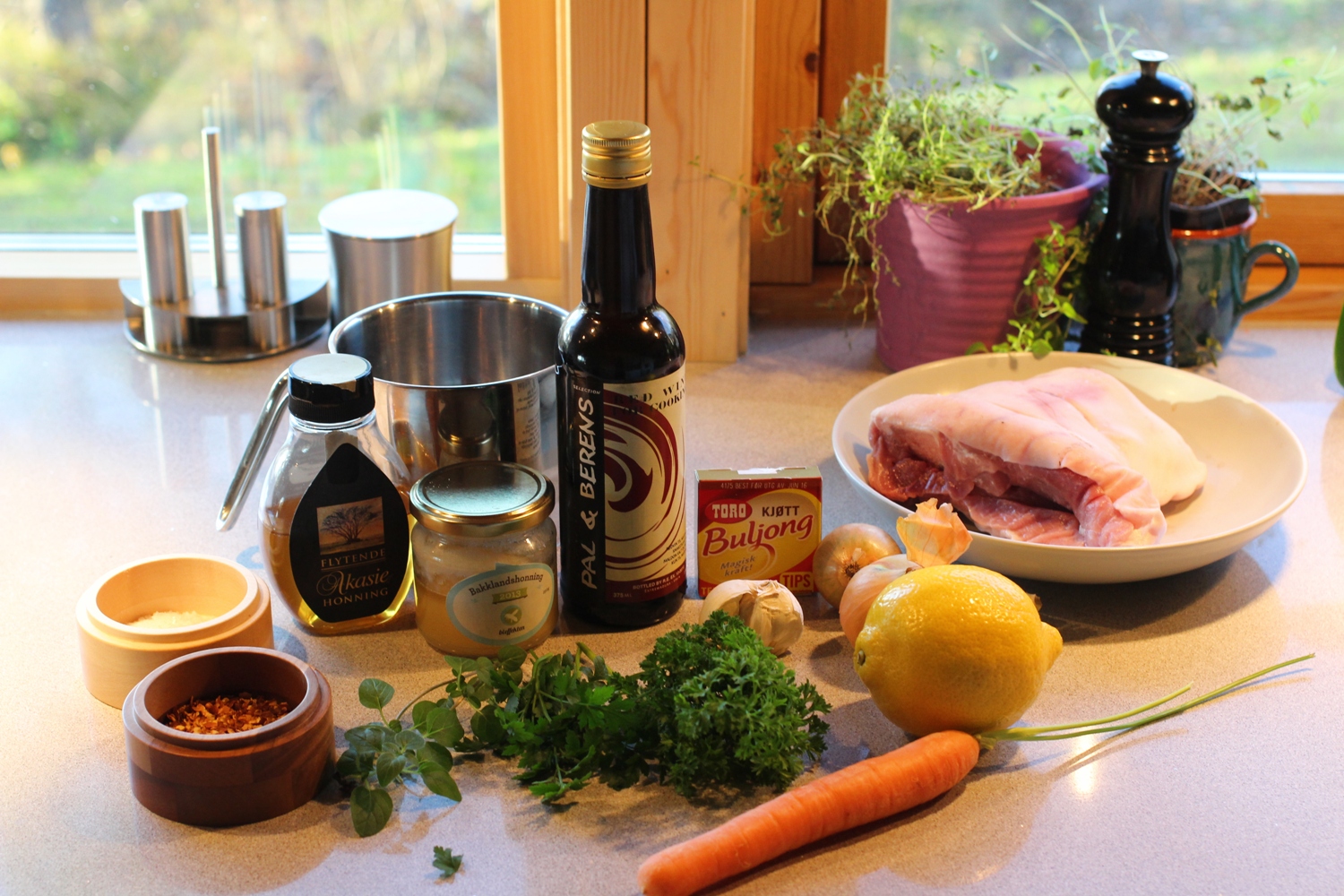 var greit i jerngryta som skanken fylte akkurat, honning skulle jo med, jeg tok ei spiseskje oppi. Jeg hadde ei flaske matrødvin, og til buljong liker jeg best de gamle gode terningene. Ikke la buljongen være for sterk, her satset jeg på 1 1/2 terning til en halv liter vann.