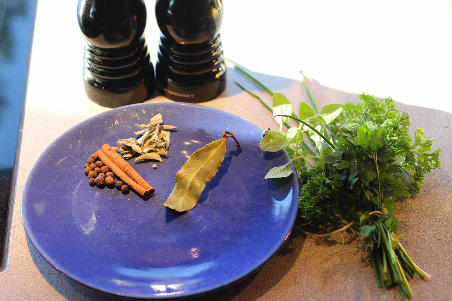 Satset også på å ha med litt grønnsaker i kokingen, et par løk og ei gulrot ble brunet lett med smør/olje i panna fulgte med i gryta.- Å velge ut krydderet ble en famling i blinde, men valgte krydder jeg har brukt i andre greske retter: I tillegg til ca 10 pepperkorn og salt (ikke for