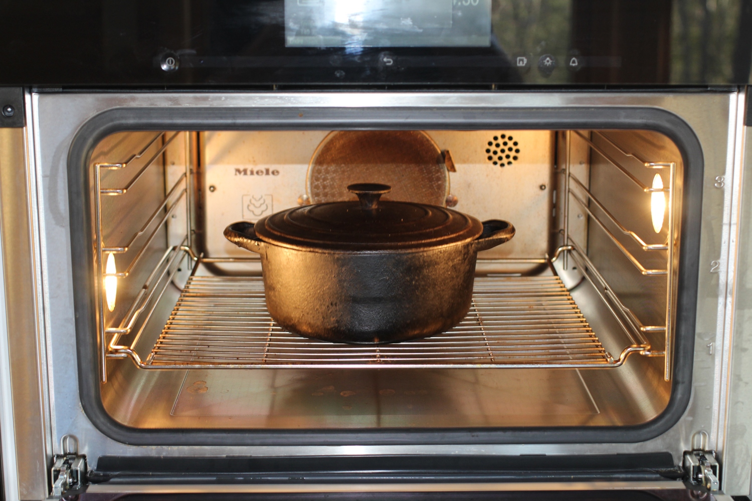 mye salt når du har buljong som skal kokes ned), saft fra ¼ sitron og en bukett friske urter fra hagen tok jeg med ei kanelstang, ca 15 hele allehånde, et laurbærblad og noen blader tørket salvie. - Alt dette ble gjort en søndag morgen, gryta ble satt inn i stekovnen for koking. Som du ser av bildet under: Kl 1001 satte