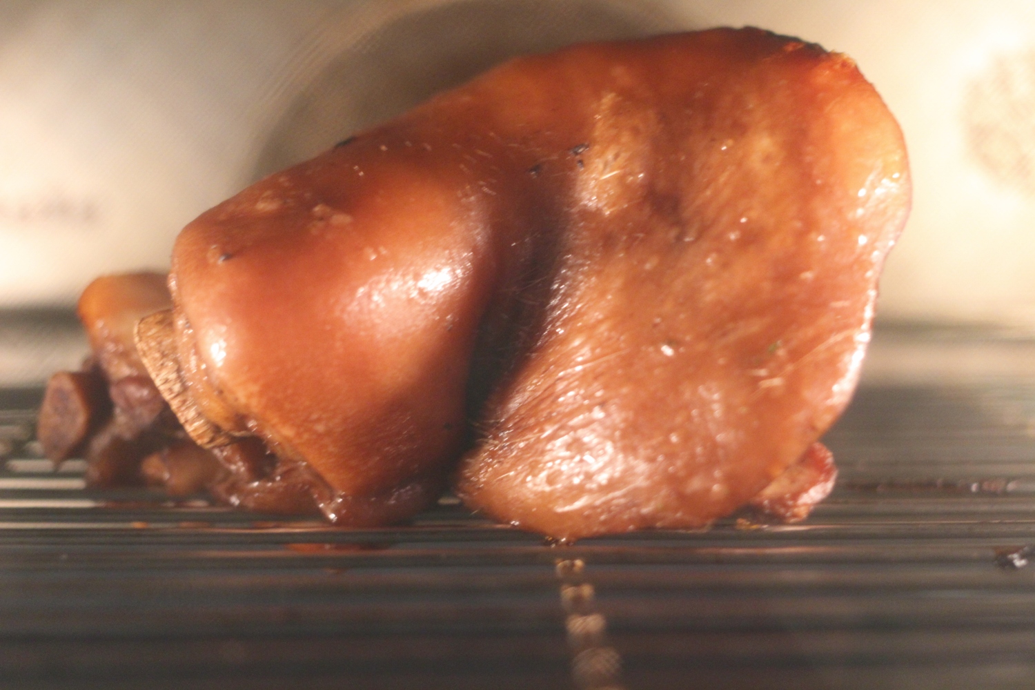 det blir en utrolig smakfull saus. Det tar 1/2 time eller så. - Mens jeg kokte, satte jeg skankene tilbake i ovnen – lot døra stå åpen til temperaturen var ned på 70 grader. Når nedkokingen er halvvegs skrur jeg temeraturen opp på 225 grader for ”bruning” ca 15 min. Jeg brukte omluftsgrill – bruk det som ovnen har for høy temperatur, men vær forsiktig dersom du bruker grill. Følg med så den ikke blir svidd. Ta et par spiseskjeer fra væska som er i nedkoking og bland med ei teskje honning og smør/hell på svoren, skanken skal bli fint glasert og mørk gylden.