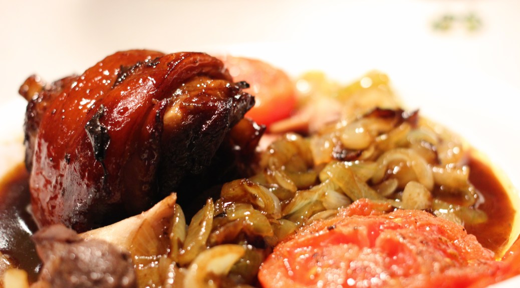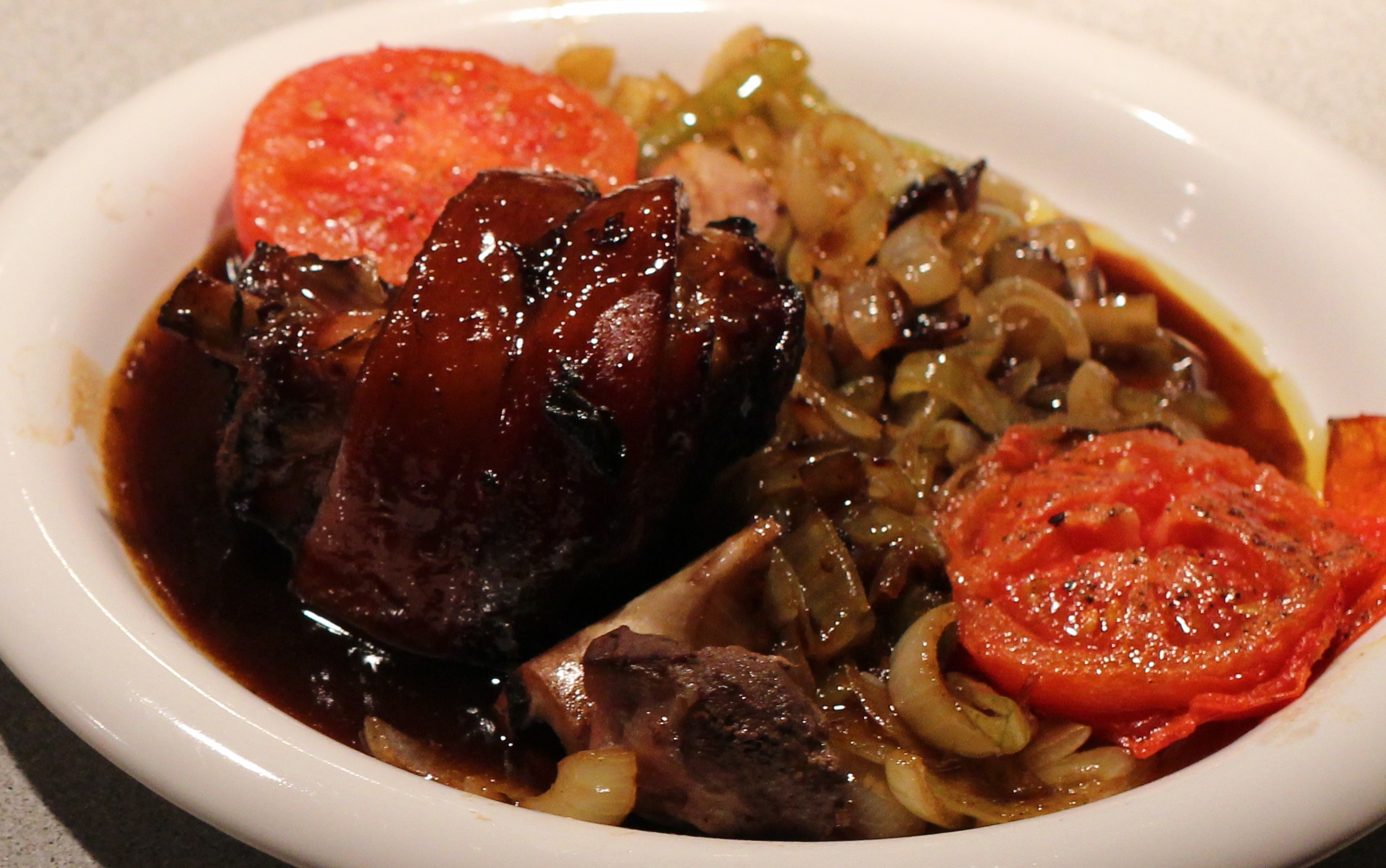 rikelig løk og to tomathalvdeler på hver tallerken før jeg heller over resten av den nedkokte sausen: Jeg fulgte bildet fra Hellas til punkt og prikke…. og sannelig, det ble ganske likt! Og smaken: Kjempegjenkjennelig, altså utrolig godt. Fersk svineskank er jo en fantastisk fin og billig råvare, og her fikk den et følge som ga den kjempeløft!