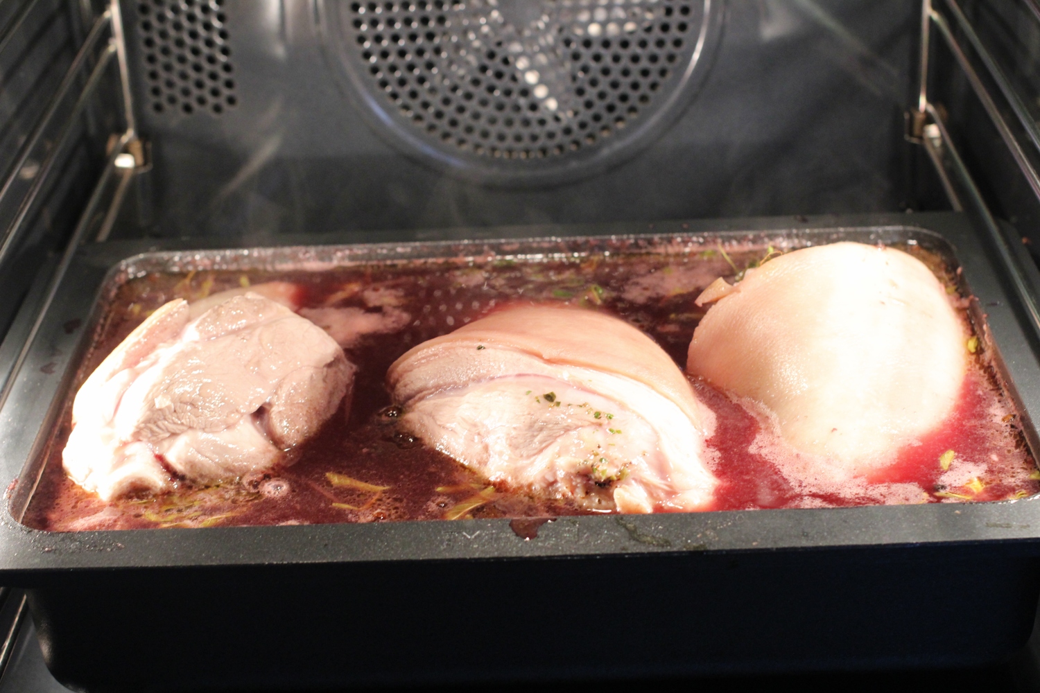 En fersk svineskank er nok til to personer. Den skal oppi ei gryte med lokk som tåler stekeovnen – lurt å finne ei som skanken(e) fyller akkurat – så det ikke blir alt for mye kokeværske.- Satset på koking i en halvblanding av rødvin og kraft/buljong. Totalt ca en liter