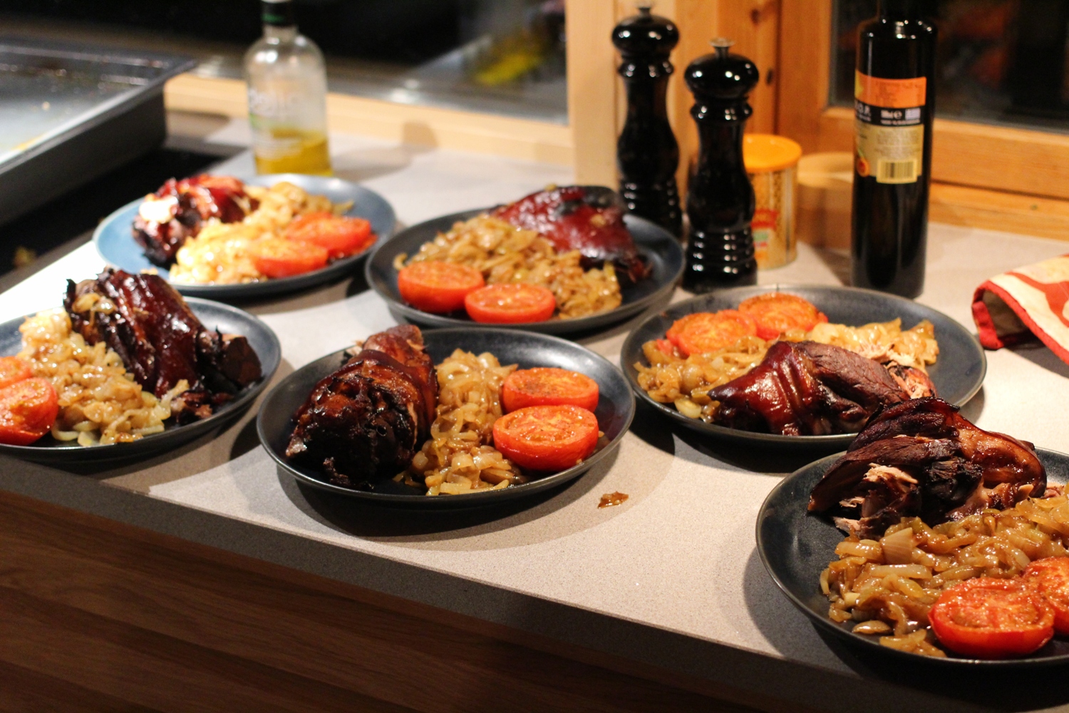 jeg inn gryta og forhåndsinnstilte 4 timer koking, 140 grader over/undervarme, ferdig kl 1830. Da var det bare å komme seg ut på tur. I etterkant kan jeg tippe på at jeg like gjerne kunne kokt i 5 timer. - Når jeg kom tilbake ved koketidas slutt forberedte jeg tilbehøret i henhold til bildet fra tavernaen: Løk og bakt tomat. Vi husket at det var ”mye” løk, jeg skjærer opp 2 per person. En stor tomat per person delt i to klargjøres med salt/pepper og en dynk med olivenolje på snittflata.