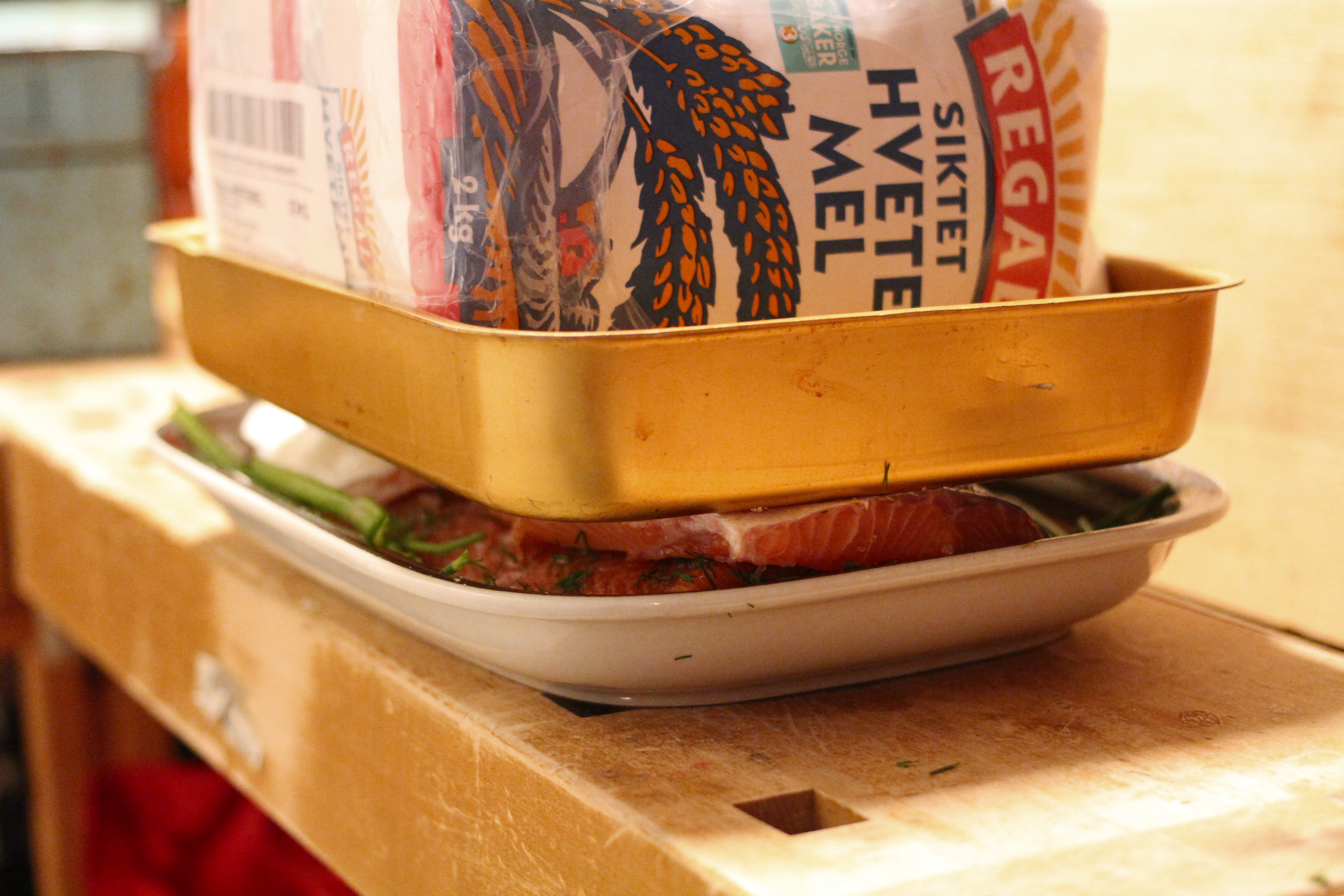 Da er det bare å sette filetene i et kjølig rom, legge noe flatt over og legge på press – fire kg mel på høvelbenken i kjelleren er en grei løsning. Salt, sukker og saft fra fisken blir nå en fin lake.- Det siste er å huske å snu de to filetene en gang i døgnet: Ta tak i begge og snu dem sammen, ikke ta en og en. Etter tre døgn er gravlaksen ferdig!