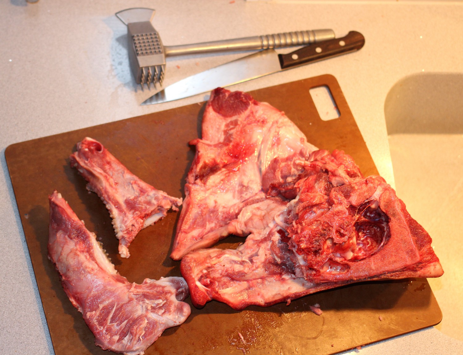 kniv gli innunder forsiktig. Prøv å få størst mulig stykker. Ta med stykker også fra trynet og haka. Da har du avdekket de mest fettrike delene, skjær fettet i skiver, tykkelse maks 1 cm tykk. Så tar du resten av kjøttet tilsvarende. Du ender til slutt opp med et ganske renskjært kranum, la øyet og munnhule og ev andre deler du ikke vil ha med bli. Skjær opp storfekjøttet tilsvarende.