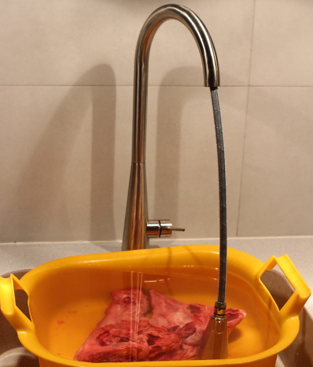 oppvasken. Legg en asjett under på den ene siden, slik at vannet får utløp på motsatt side, Start med å la vannet renne med fult trykk slik at hodet «spyles». Skift ut vannet helt, så kan du la en tynn stråle sørge for utskifting av vannet natta gjennom.