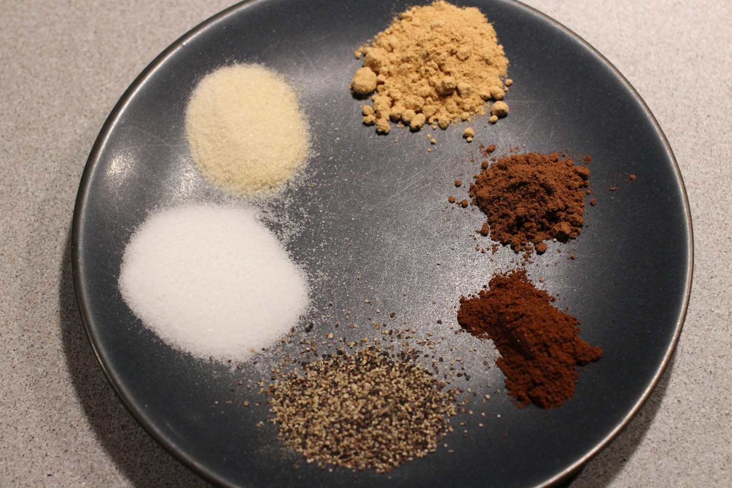 ss salt, 1 ts av henholdsvis malt pepper, nellik, allehånde og ingefær. Ta så med 2 ts gelatinpulver (Hakket svor gjør også nytten som stivelse, men min erfaring er at alt trengs til «lokk» på sylta.)