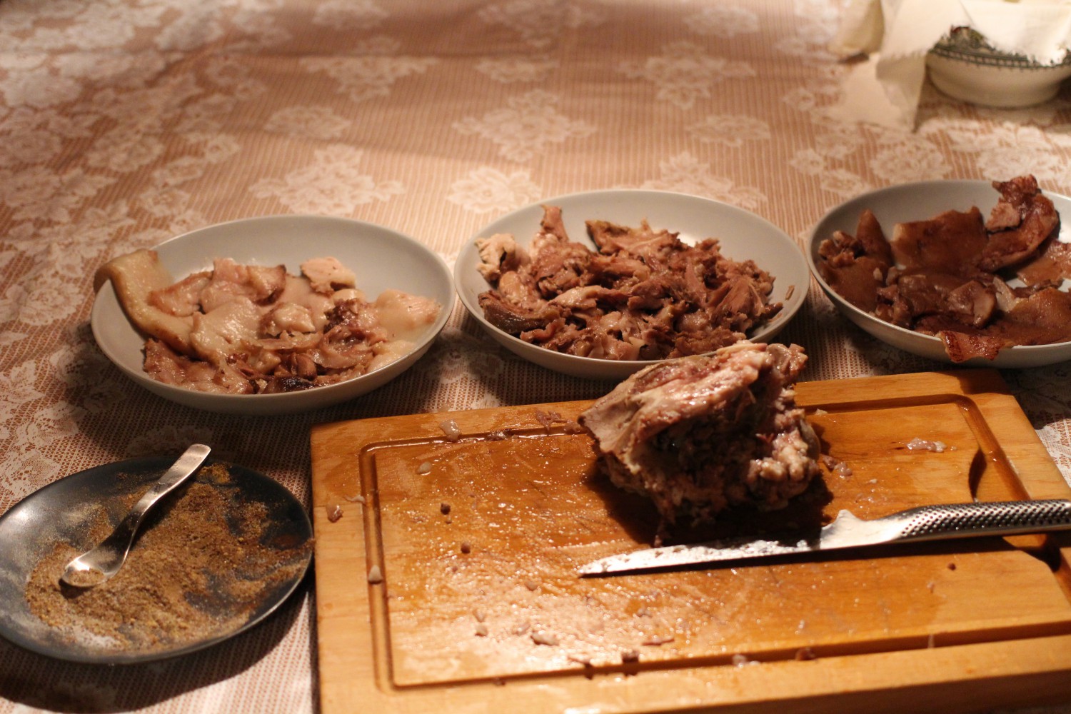 Ta hodet og ileggskjøtettet opp av kokevannet, behold vannet. Da begynner skjæringen, jeg sorterer: Først svoren ved å la en skarp