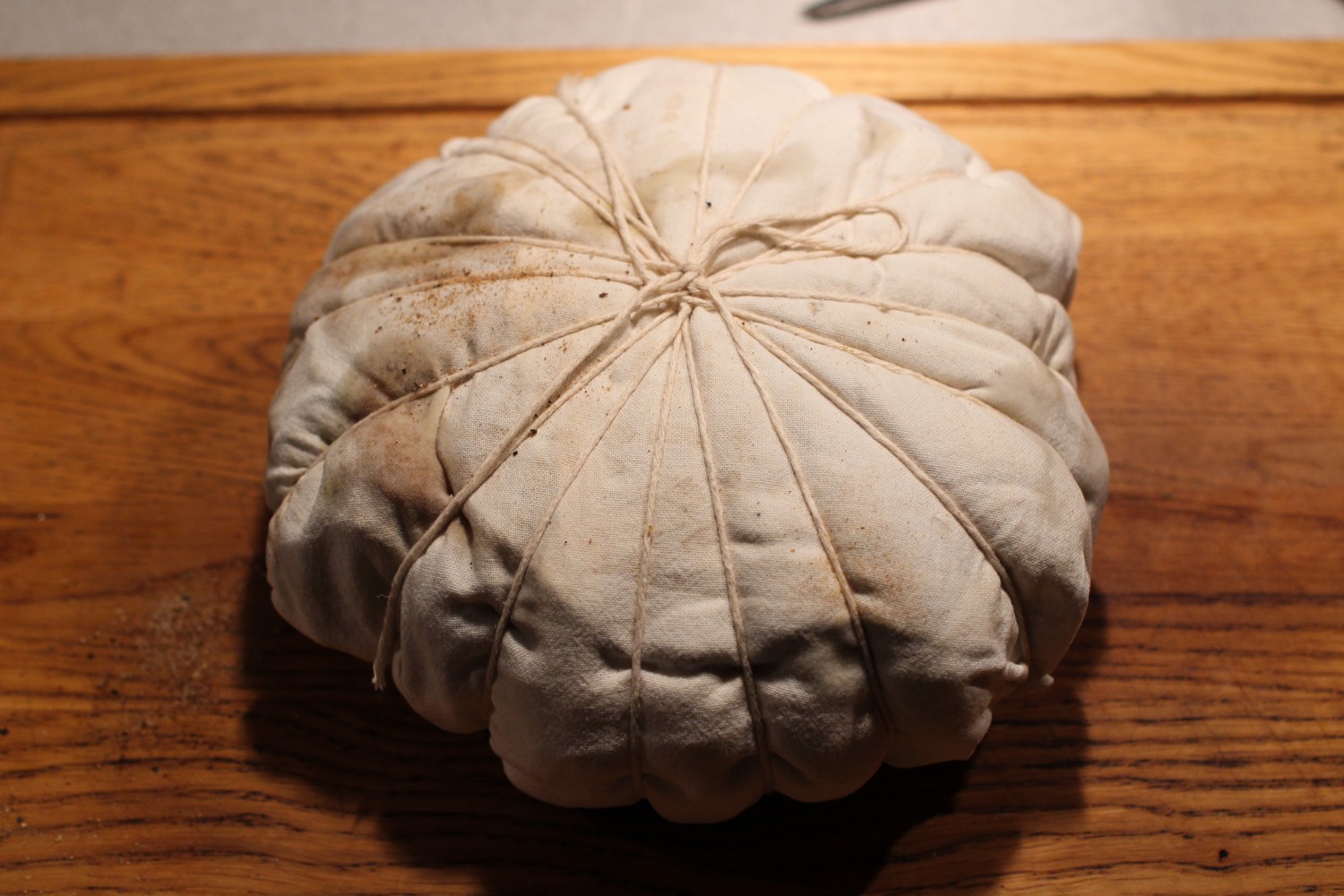 forsiktig lerretet og prøv å få tøyet mest mulig jevnt, bind så sammen med en hyssing, start med å binde sammen i to retninger vinkelrett – har du noen til å hjelpe deg å holde går det enklere…. Så surrer du med hyssingen i jevnt stjernemønster til sylta holdes godt sammen: Før hyssingen til midten, tre den under de trådene som er der og ta den