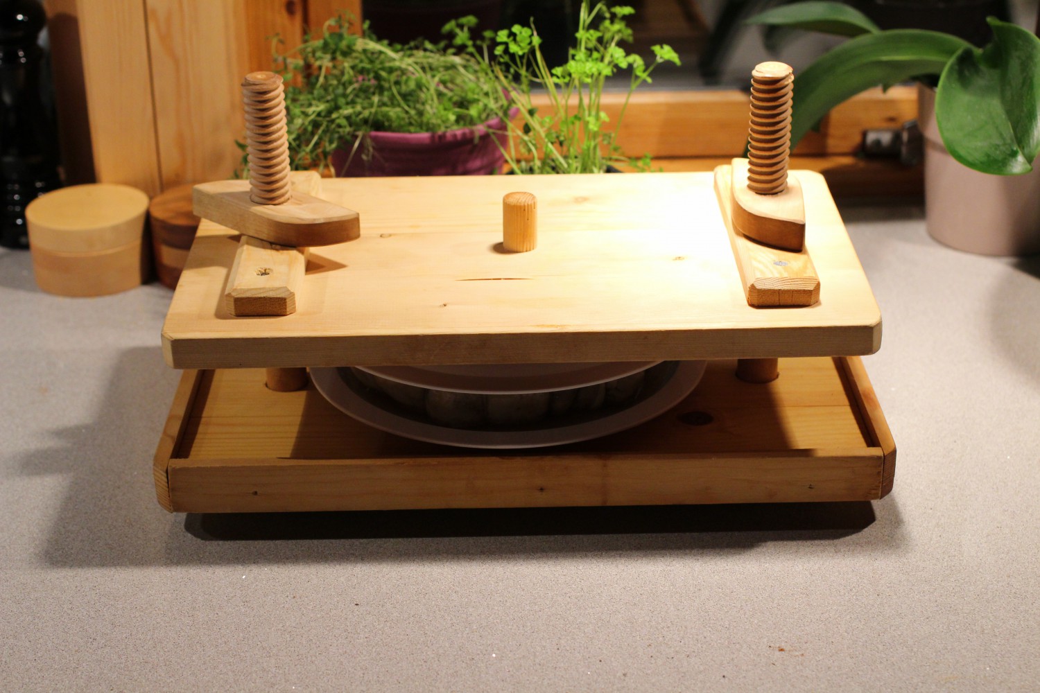 ut igjen i en ny retning. Et lite triks er å avslutte med å putte hyssingen under trådene i senterpunktet slik at den samler alle trådene fint i midten. Så legges sylta tilbake i kokevannet og trekkes ca 20 minutt for at den skal være god og varm når du legger den over i press: For å presse er det bare å bruke fatasie,n med et egnet fat og noe tungt på toppen, jeg har ei presse som jeg bruker, med en tallerken over og under. Stram forsliktig til litt etter hvert til det er stramt nok etter ca 1/2 time, da er det bare å sette pressa kalt. Så pakkes sylta ut neste kveld – vær forsiktig, lerret og ev folie er klistret godt sammen med sylta, lirk det av med en stekespade eller