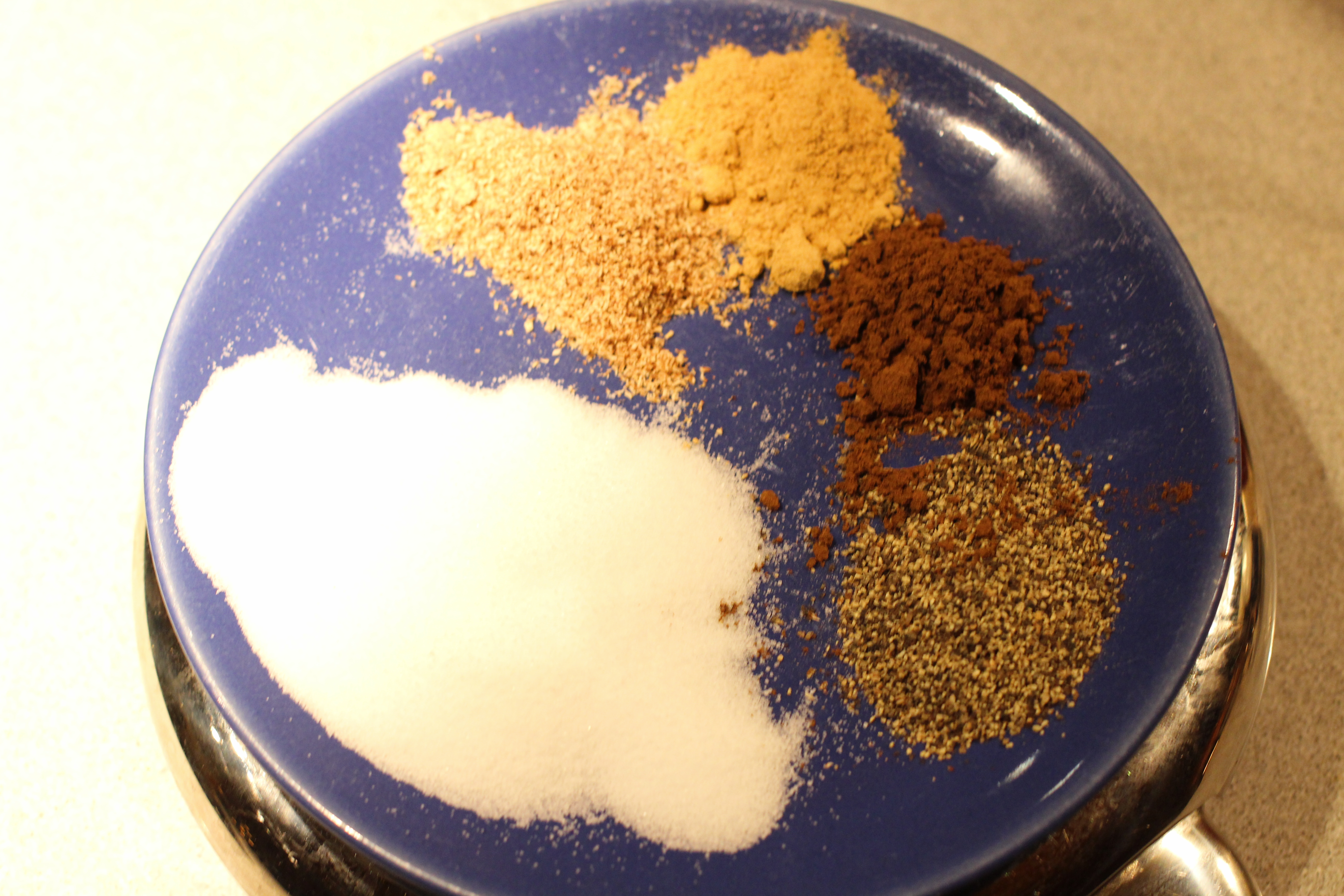 Så tar du 100 g kavring som knuses, bruk feks. en stor morter. Bland den i alt som har vært i kjøttkverna og tilsett krydder:
