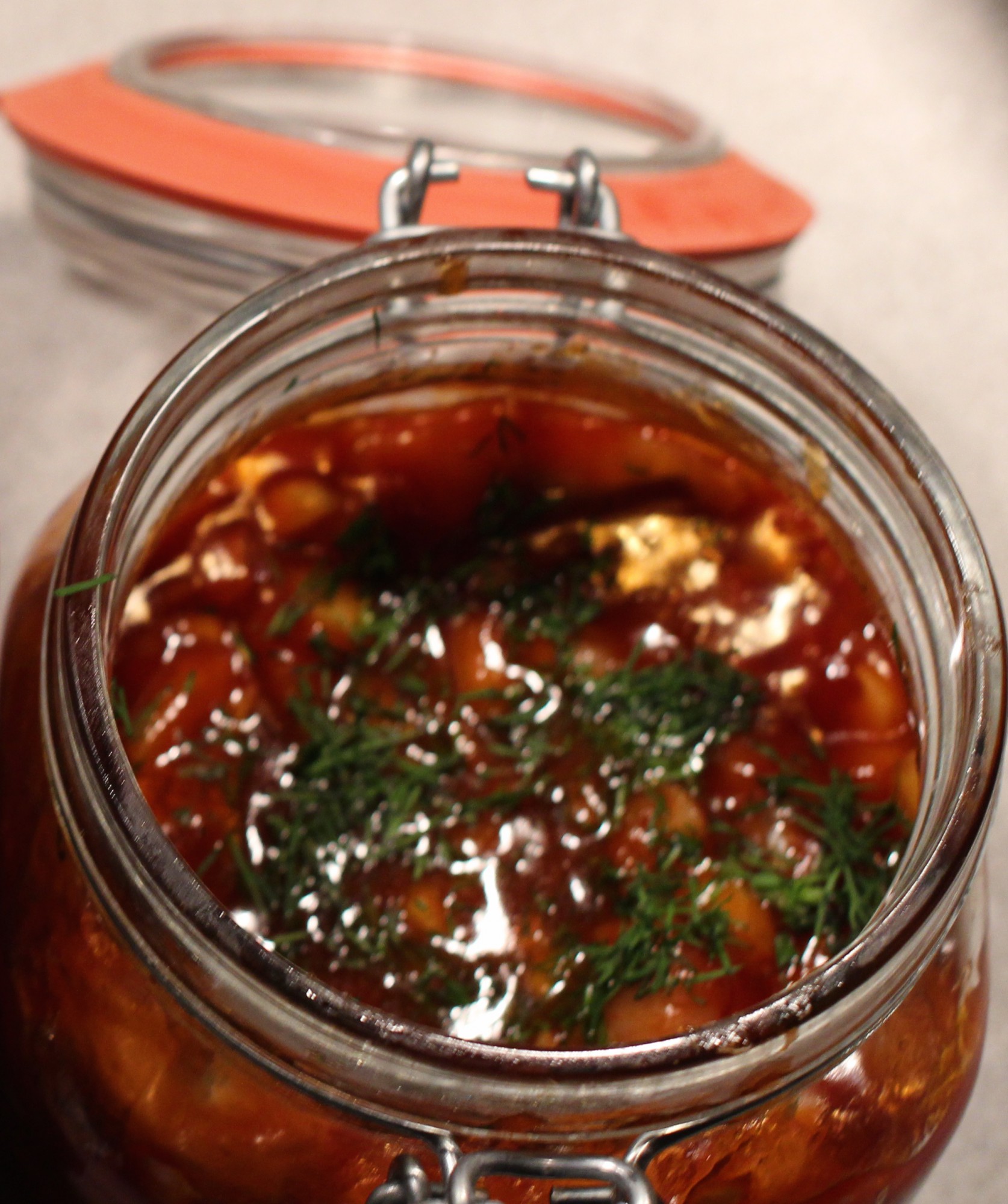 Den andre klassikeren i familien er tomatsild – den lages også i en fei! Dette blir en litt mindre porsjon enn glassmestersilda: