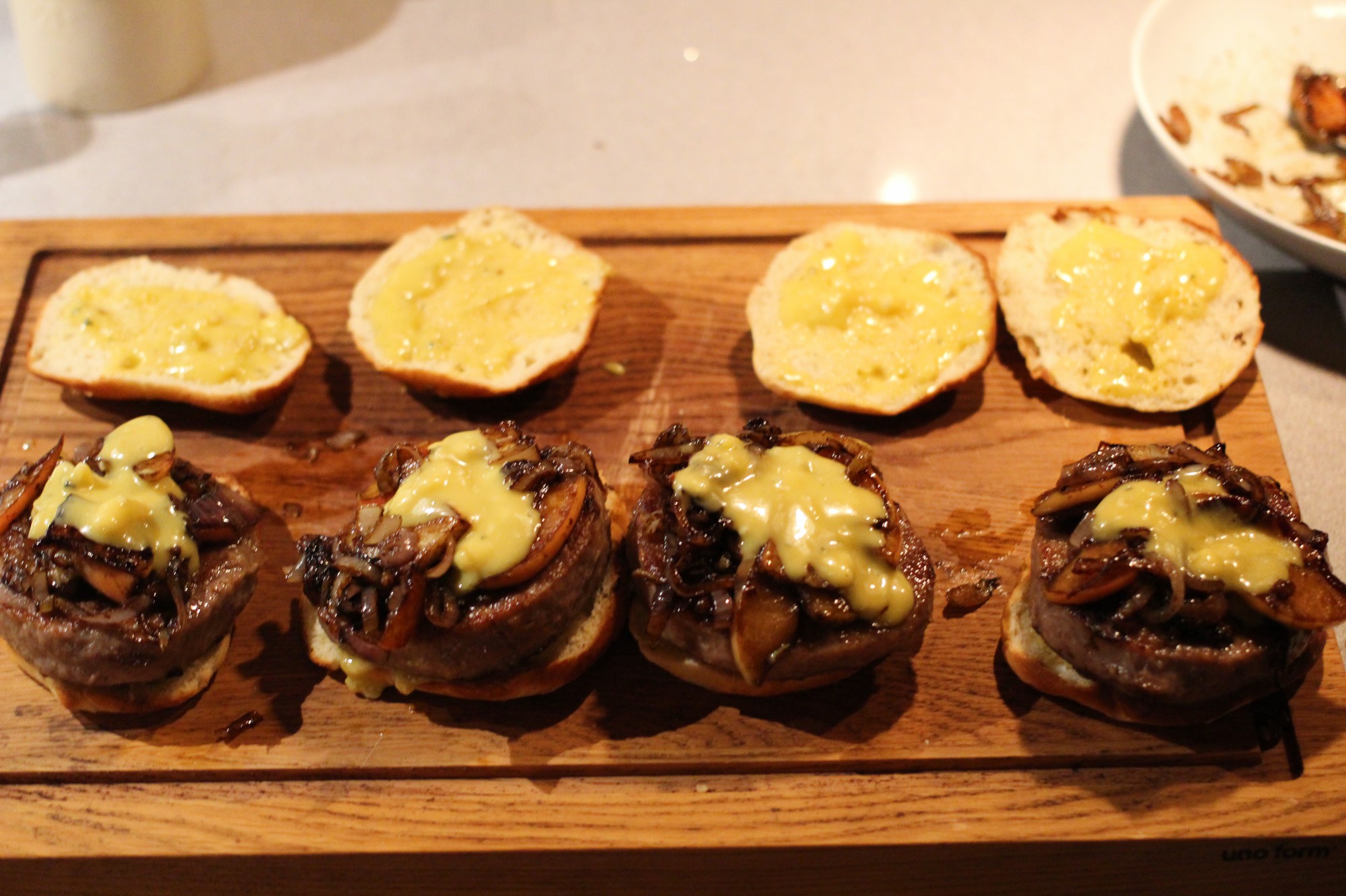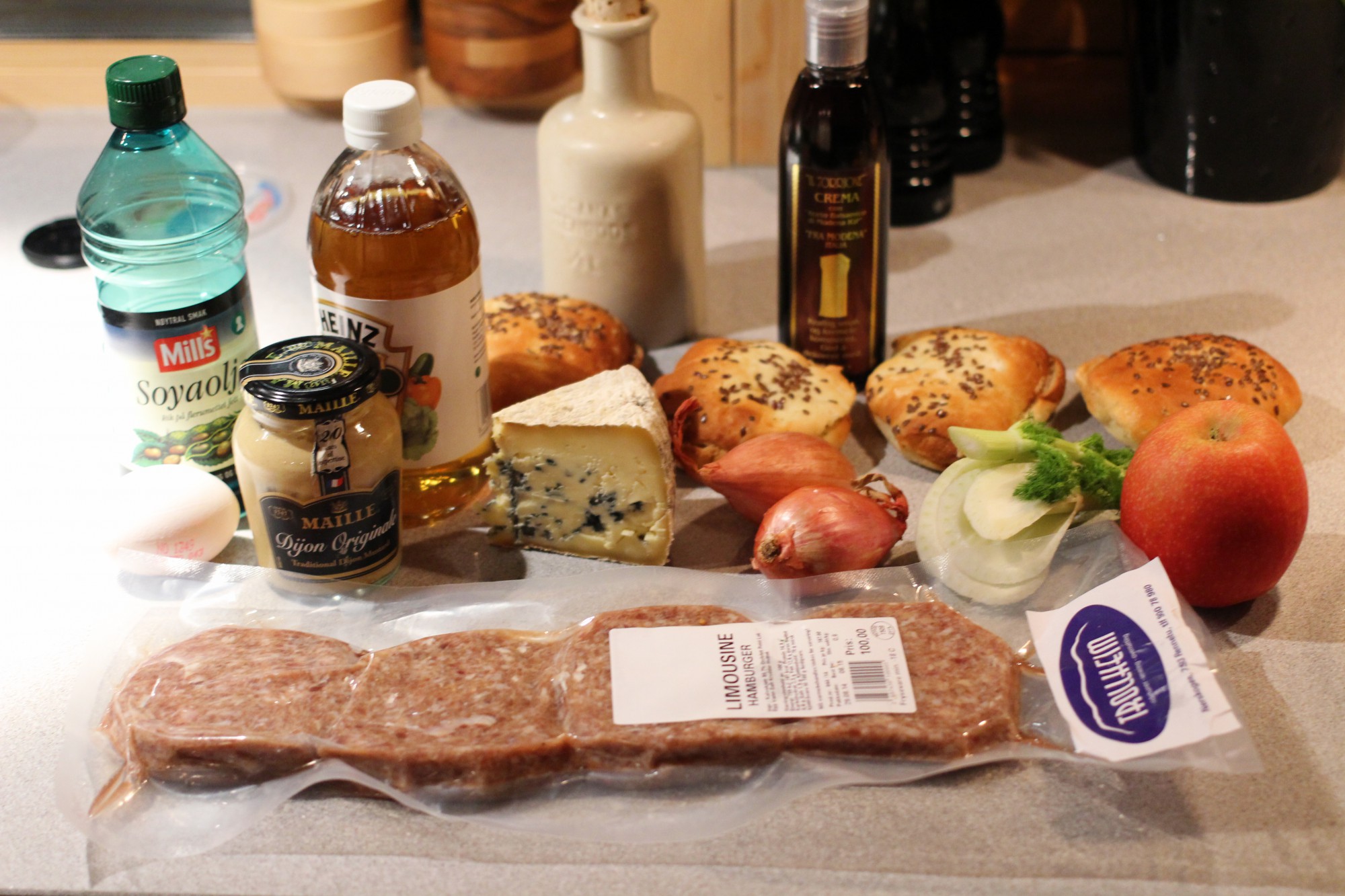 - Da gjenstår bare å sette sammen hamburgerne med brød, blåmuggostmajones og balsamico-eple/fenikkel/løk. Sammen blir det smakfullt og saftig!