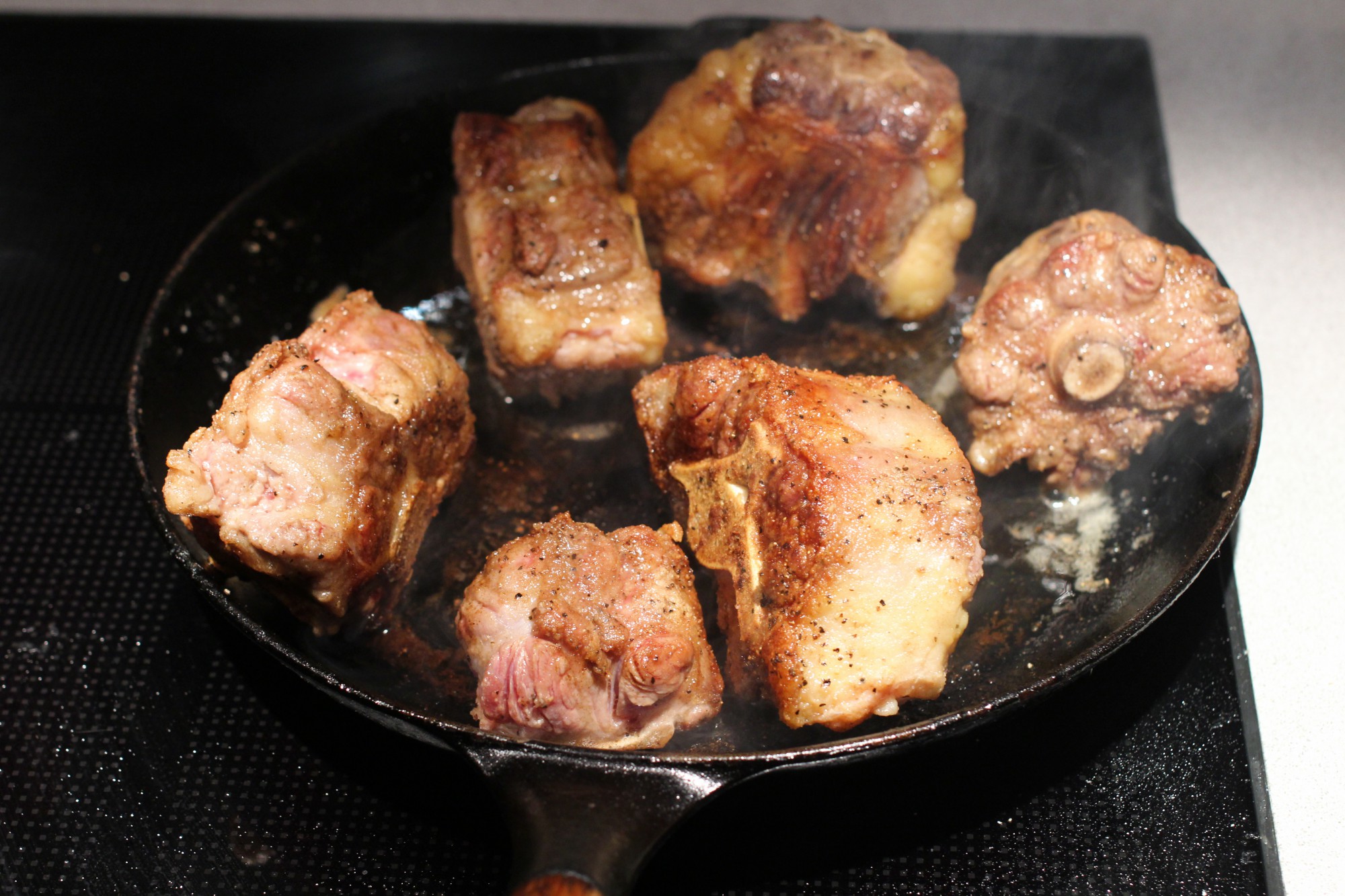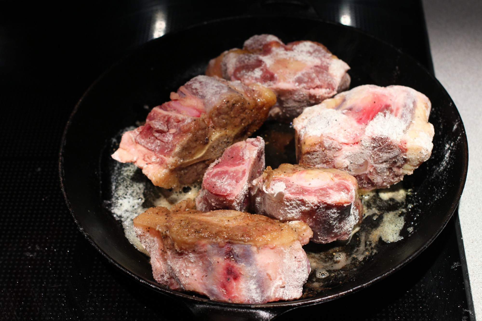 Til 4 personer bruker jeg en pakke med 1,3 kg oksehaler. Før du bruner stykkene i varm stekepanne med smør/rapsolje rulles de i melblanding med salt og pepper: 2 ss hvetemel, 1 ts salt og 1 ts pepper.