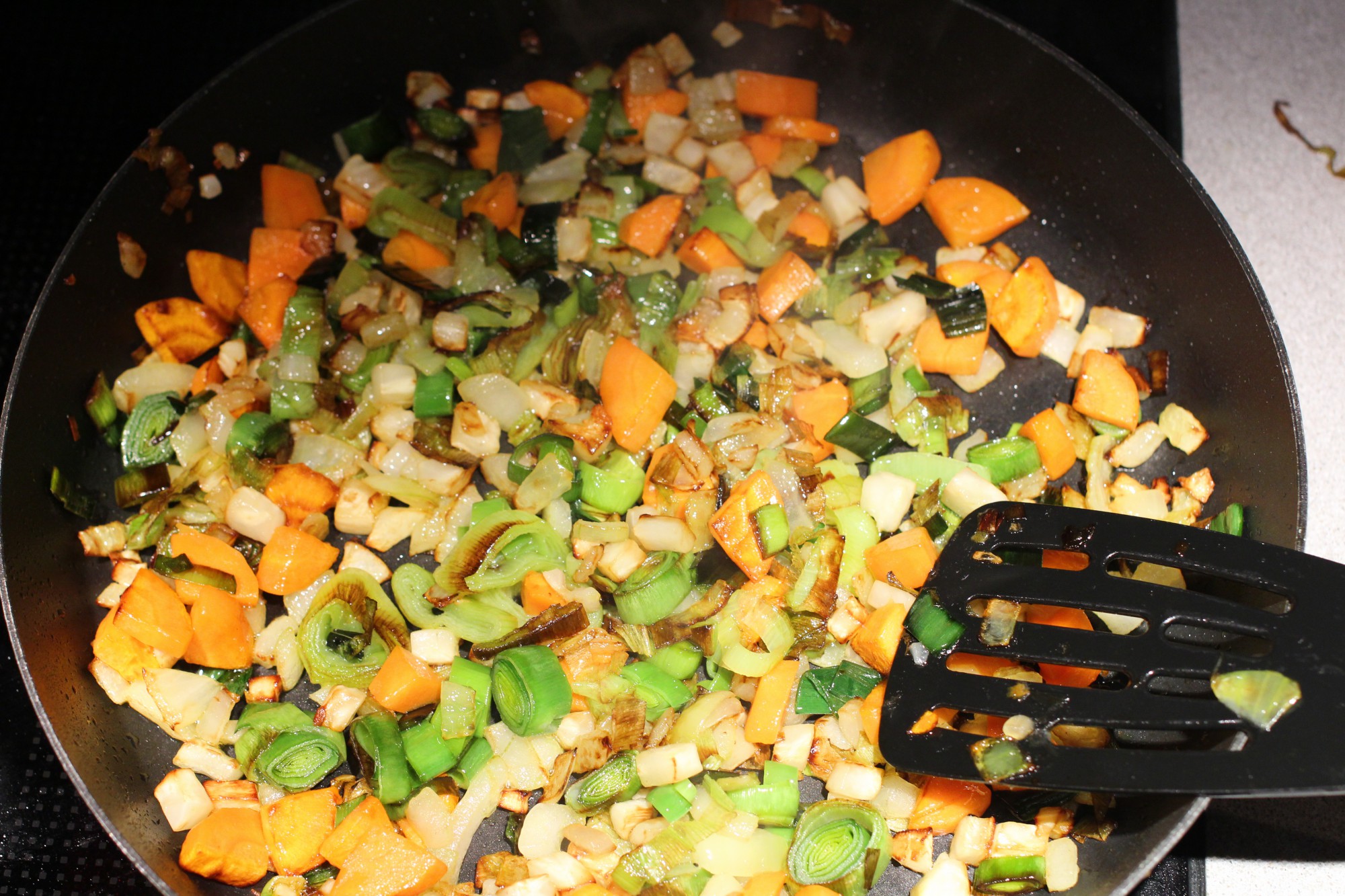 - Alle grønnsaker som skal med, skjæres opp og brunes også godt i