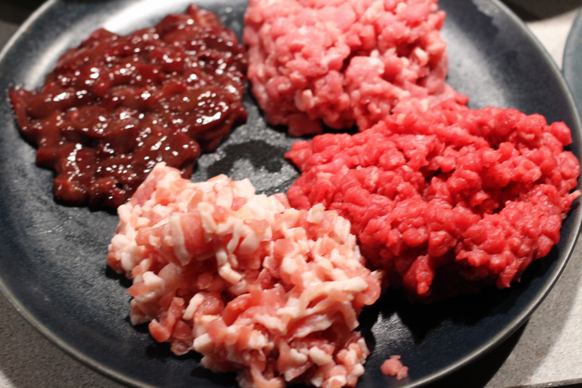 Kjøttvarer, alt hakkes med en skap kniv (Da får du litt mer konsistens enn ved å bruke deig eller å kverne):