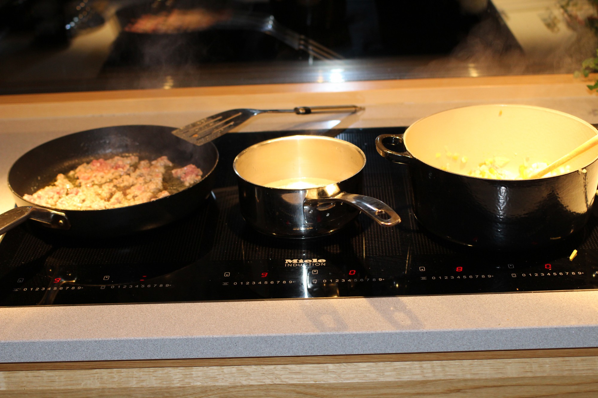 koking, la fettet være igjen i panna for stekingen av kjøttet og leveren, ta det porsjonsvis, og suppler med smør og olivenolje. Alt skal bli jevnt brunet, men ikke svidd. Så tar du de hakkede grønnsakene i stekepanna tilsvarende – la de få tydelig farge før de følger etter i gryta. Til slutt passer du på at panna ikke er for varm, hell på litt olivenolje før du legger i hvitløken – som surres, den skal ikke få farge, bare myknes.