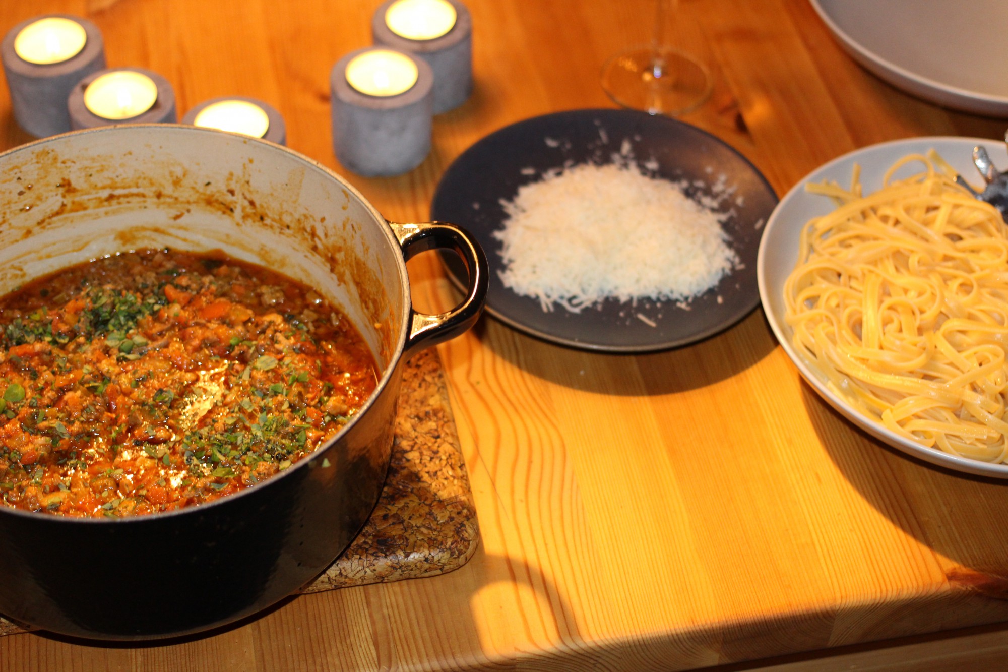 Bolognese kan du jo lage raskt ved å kjøpe et glass saus, men det blir ikke det jeg forbinder med skikkelig spagetti bolognese. Den beste bolognesen jeg har opplevd fikk jeg faktisk av alle plasser i verden i Portugal. Har prøvd å nærme meg den – nå føler jeg at det begynner å smake….