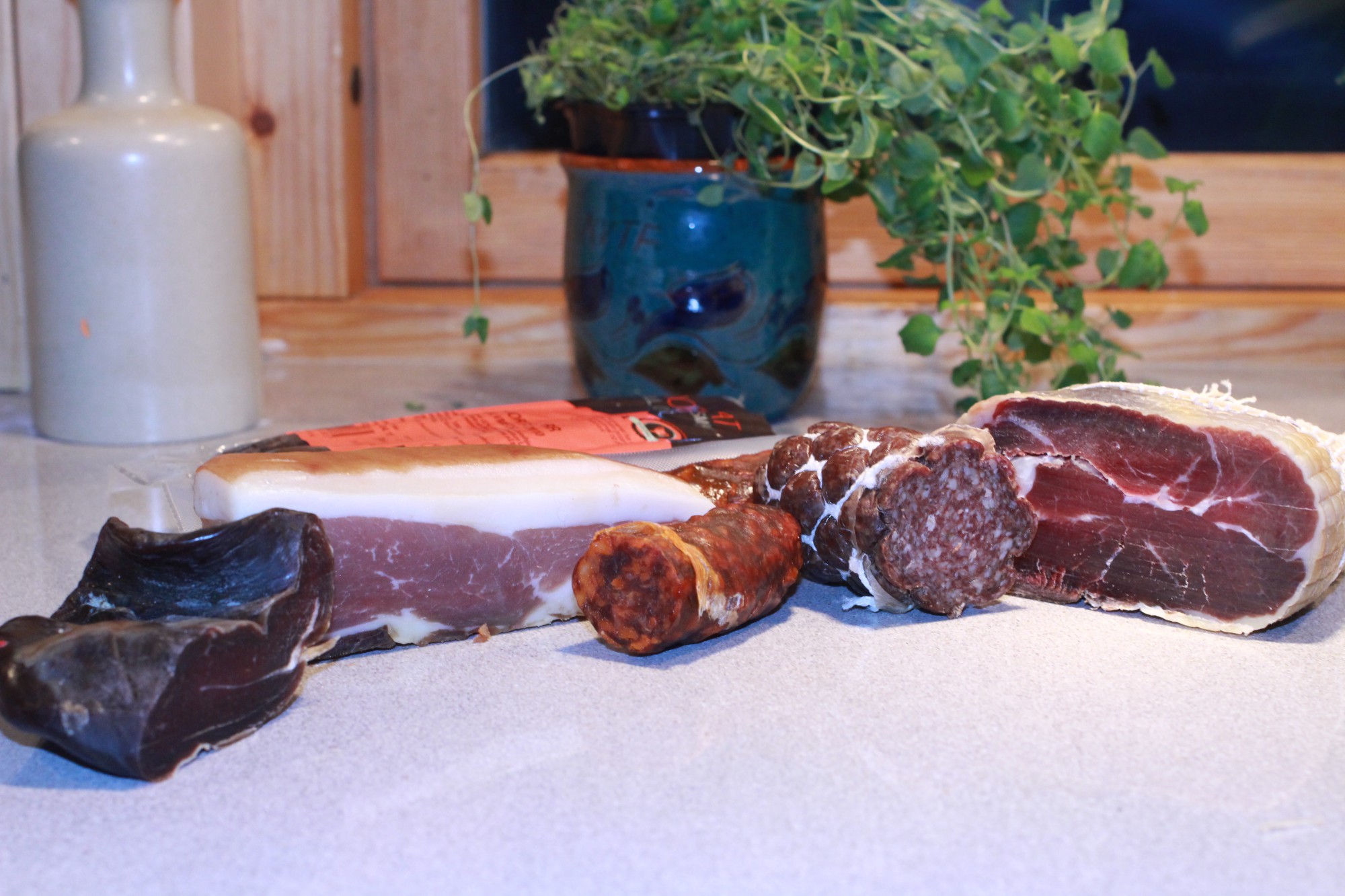 Hadde en liten rest utmerket rakfisk fra Tydalfisk liggende etter jul, men ikke nok til en fullverdig middag. Da er det greit å supplere med spekemat, som jeg alltid har i huset. Vi har en førsteklasses produsent i Rennebu: Hognamat, som jeg gjerne slår et slag for!Du finner produktene fra Hognamat på Bondens marked og i flere dagligvarebutikker – og selvsagt på Rennebumartnan. På bildet over ser du lageret som jeg denne dagen hadde i kjøleskapet: Utbeinet fenalår er gullmedaljebelønnet, spekeskinka er på samme nivå, så er det mange spennende pølser – også med medaljer, her biffchorizo med chili, hjortemorr, fårepølse med rips og viltpølse med einebær.