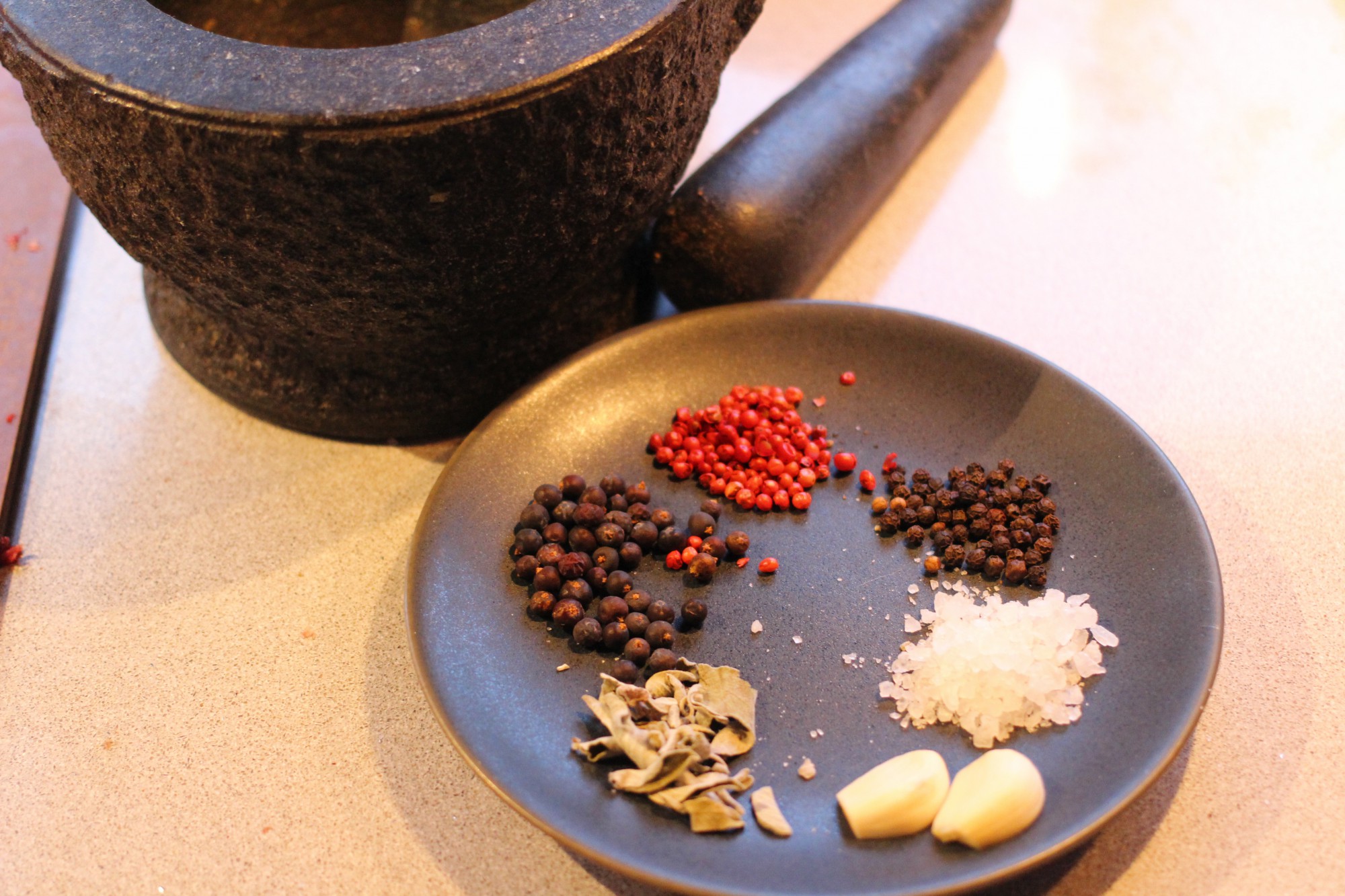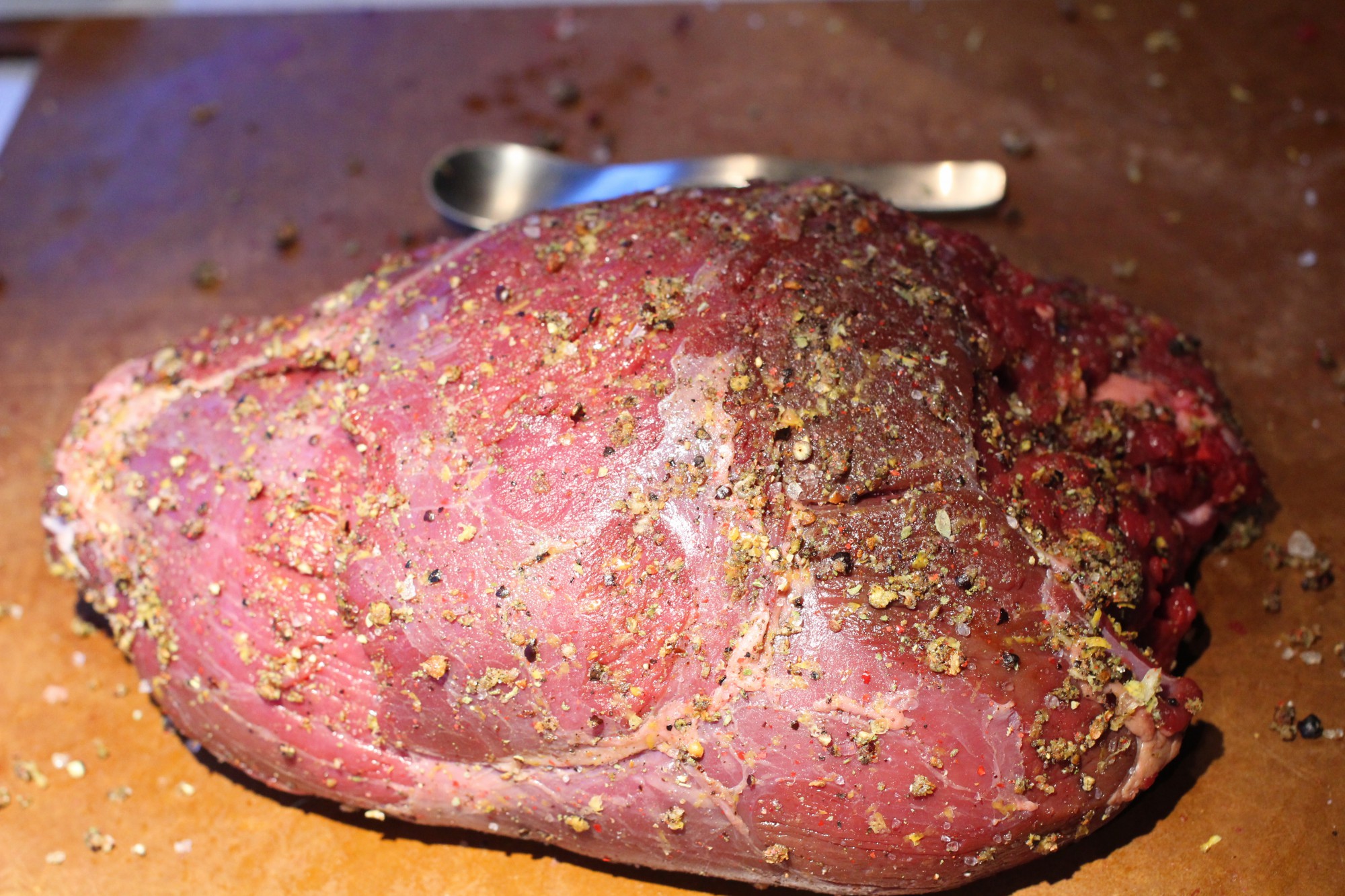 - Lårstykket som jeg renskjærte var knapt 2 kg. Til reinskjøtt holder jeg fast på noen grunnkrydder: Opp i morteren med 2 ss einebær, 1 ss tørket salvie, 2 ts svart pepper og 2 ts rosepepper, 1,5 ss grovsalt og 2-3 hvitløksfedd. Knuses godt og blandes med revet sitronskall.