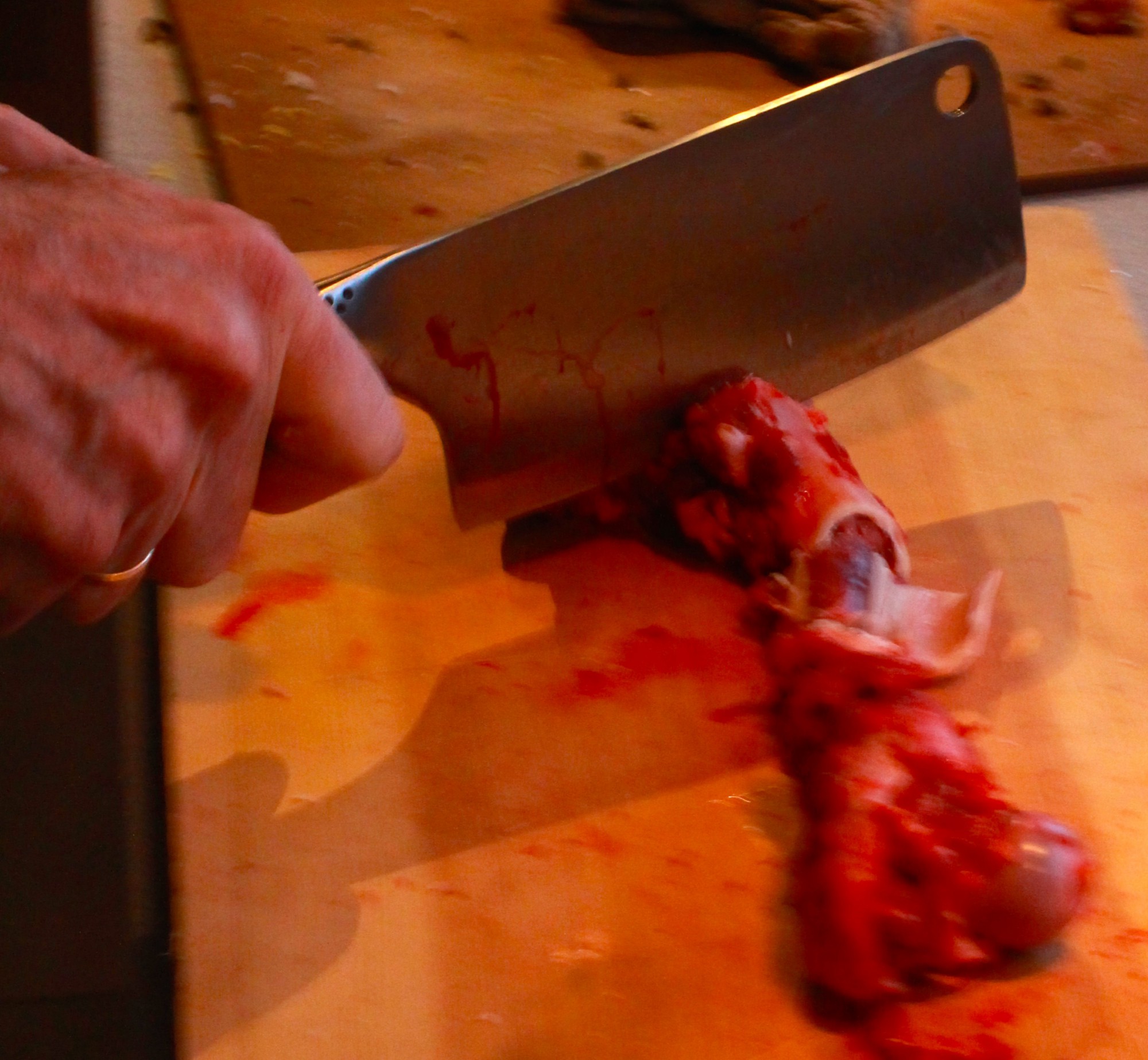 - Så er det kraftkokingen: Beinet deles opp i stykker med kjøttøks – eller du kan bruke baufil. Det må kappes slik at margen kommer fram.