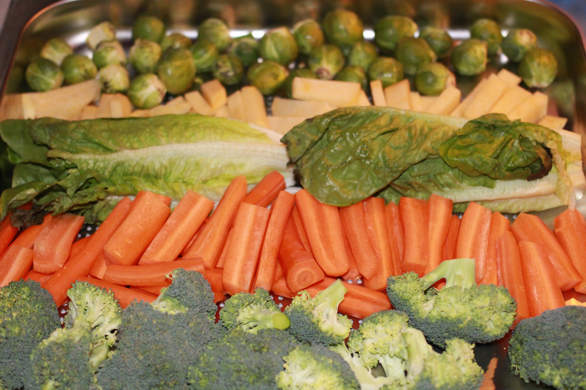 - Gjør klar tilbehør -Jeg serverer med dampkokte grønnsaker: Rosenkål, søtpotet, hjertesalat, gulerot og brokoli. Og bakte potetbåter.