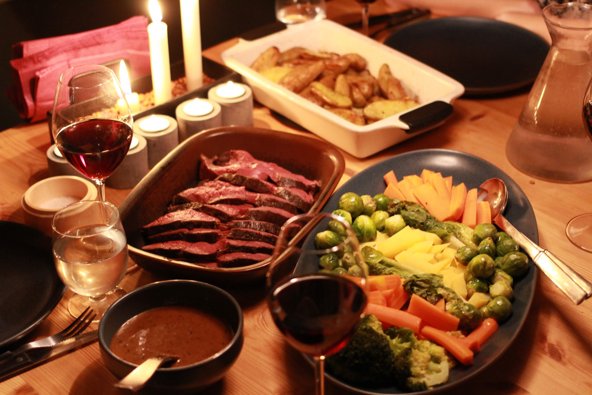På bondens marked i Trondheim fikk jeg tak i et fantastisk kjøttstykke fra Fjellvilt AS (Bransfjell innenfor Røros): Et helt reinsdyrlår med bein. Hadde en drøm om et stort måltid med mange rundt bordet. Dessverre kolliderte det med mye annet, så jeg måtte nedjustere til seks personer – og da ble hele låret vel stort. Valgte å beine ut og dele opp kjøttstykket i to – og bruke det flotte beinet til kraftkoking.