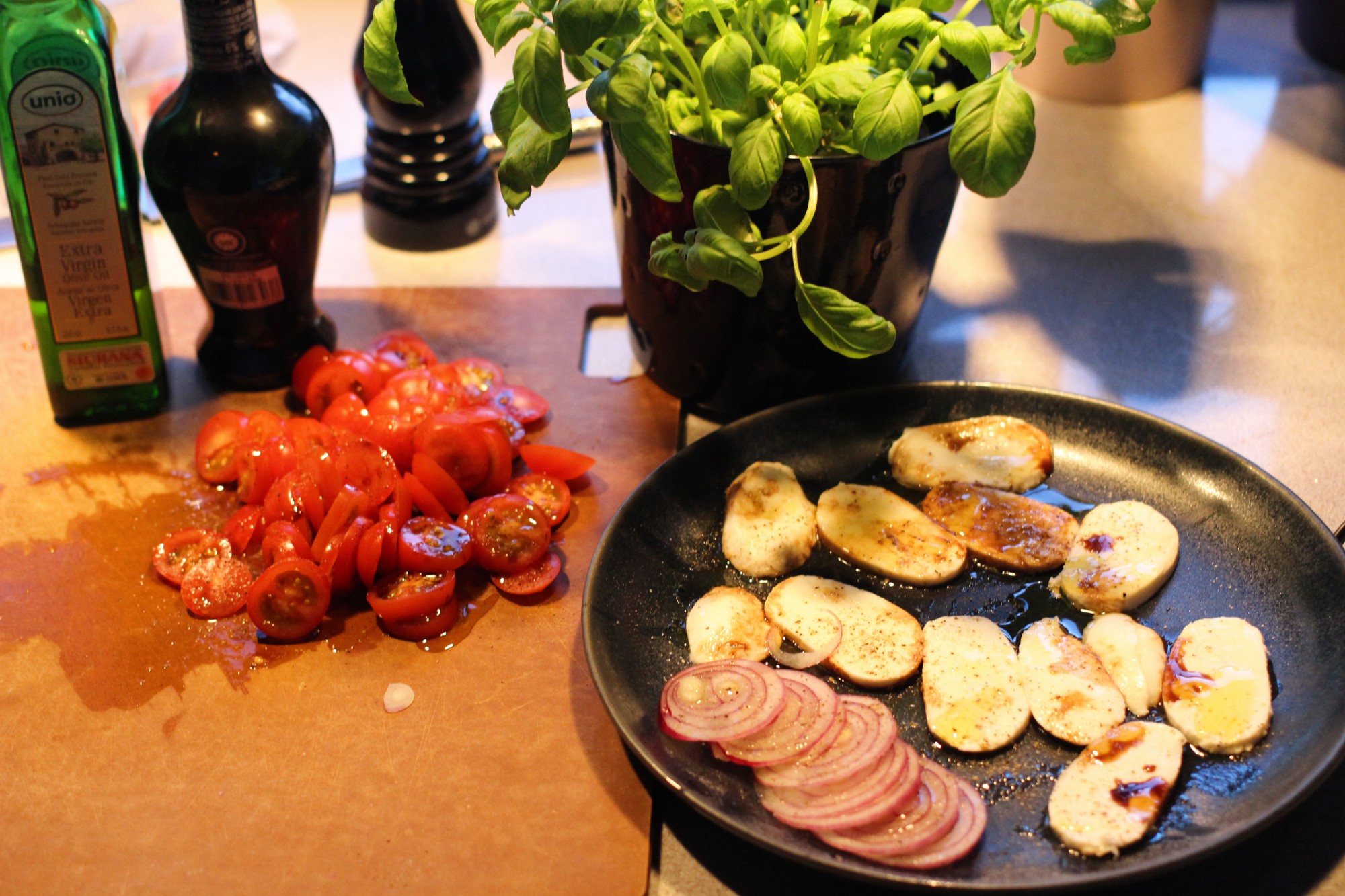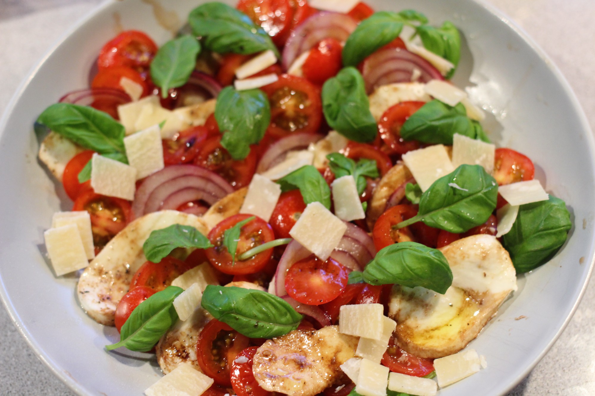 - Legg lagvis på et fat, løkskiver og mozzarella som takstein. Dynk alt med balsamico og olivenolje, kvern godt med pepper og salt over og la det trekke 10-20 minutt. Legg så på basillkumblader og eventuelt parmesanskiver. En kjapp og lett liten rett – passer det til anledningen så er en enkel prosecco ikke av veien som følge.