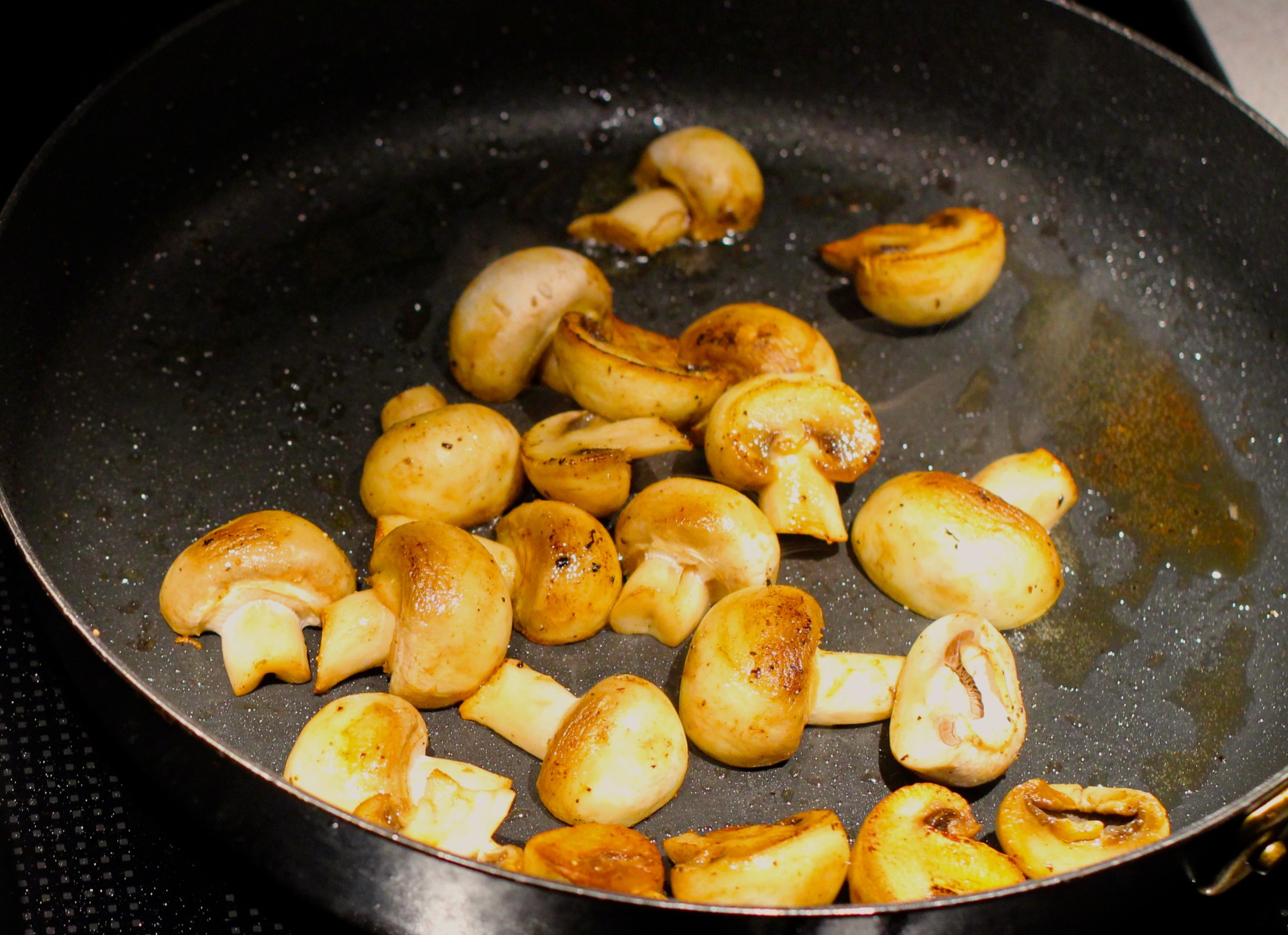 - Legg den så over i en ildfast form med litt olivenolje i bunnen, suppler eventuelt med tilbehør som kan være med i ovnen: Denne gangen har jeg fylt på med brunet champignon og cherrytomat, sørg for at tilbehøret får litt olivenolje (rør det sammen med olja i panna) og gi et dryss med salt og pepper