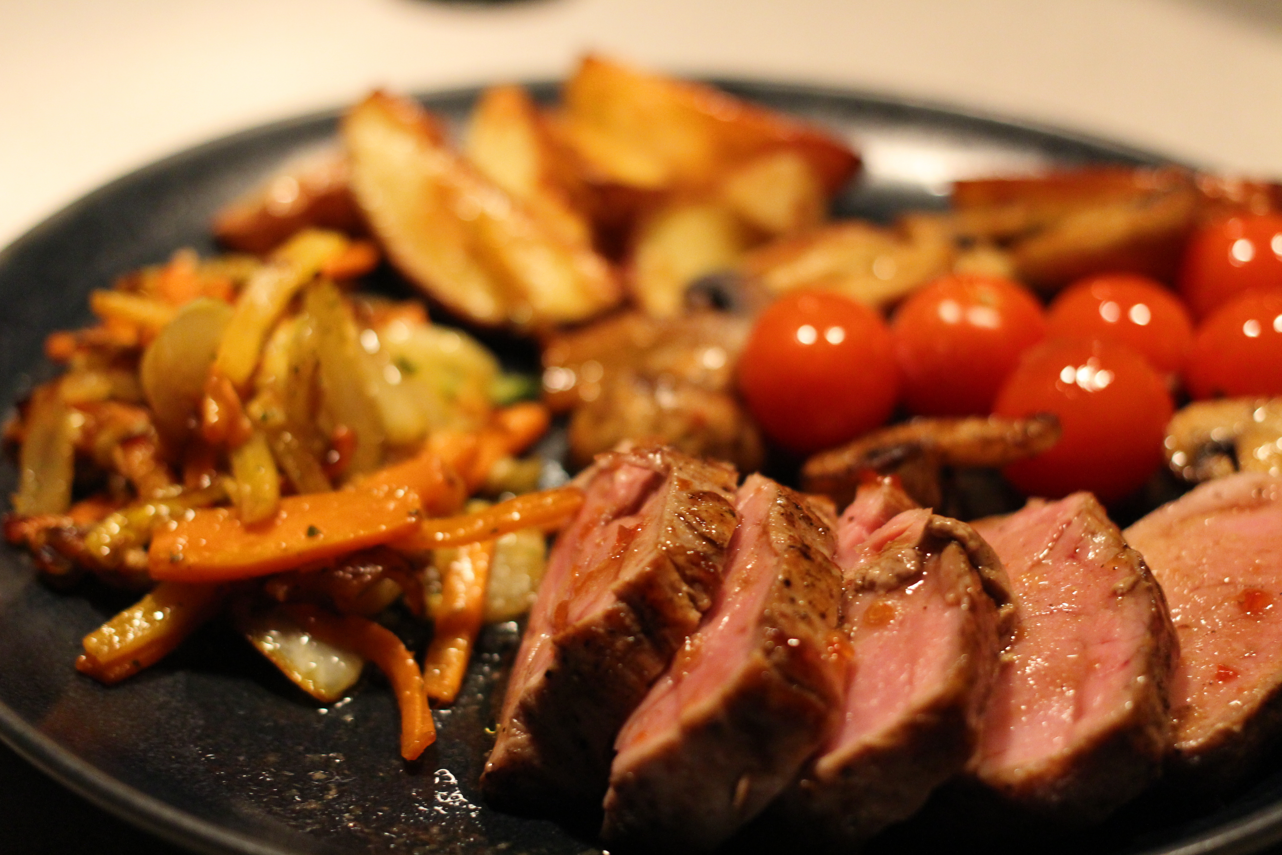 og kålrabi i panna og har stekte potetbåter denne gangen, men det kunne like gjerne vært rotmos, parmesanpotet eller balsamicopotet. - Når kjernetemperaturen er nådd tas formen ut, legg over en
