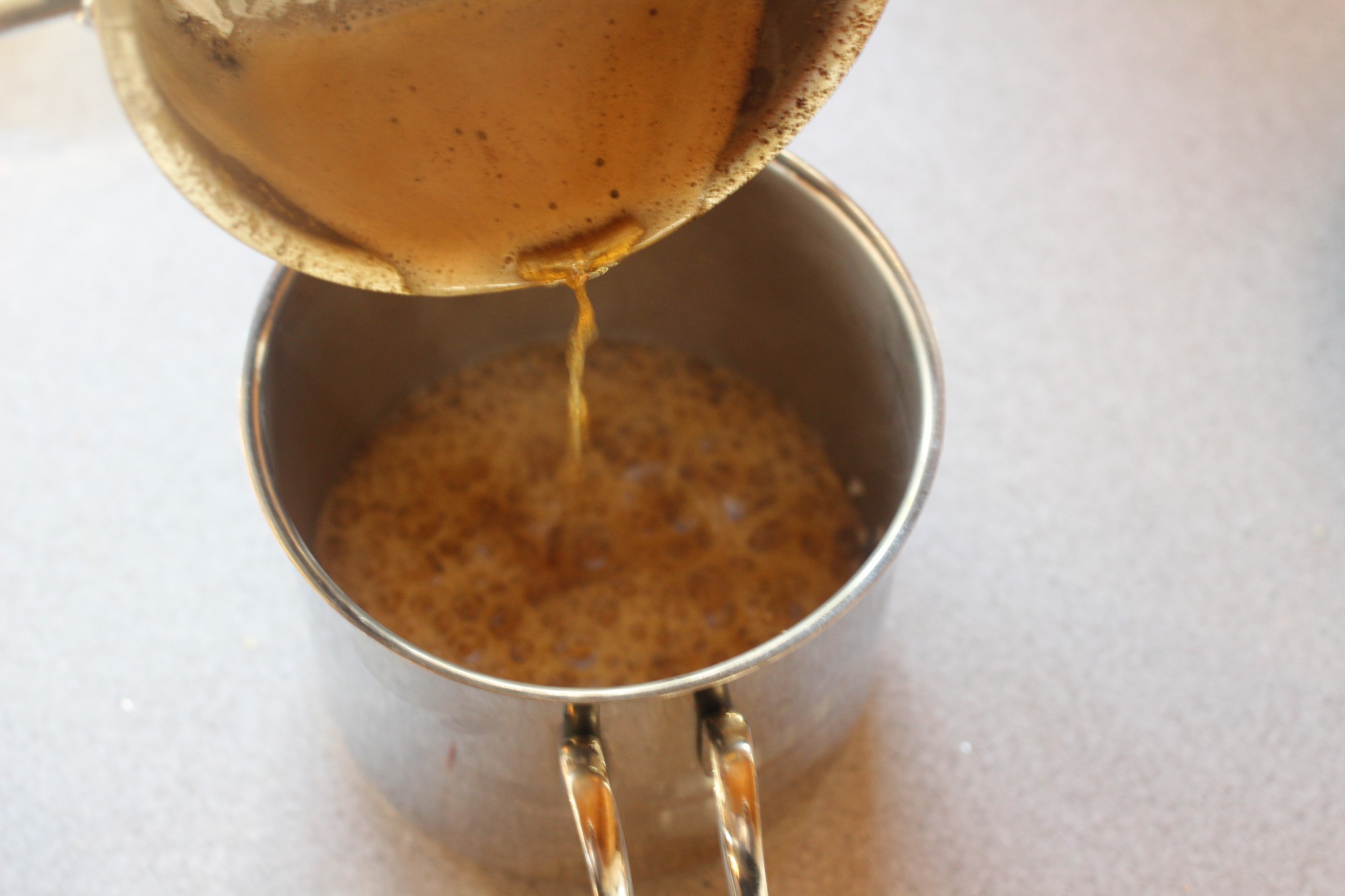 Når smøret er passe, tar du det med en gang – mens det er helt varmt – og heller det over nøtte/løk-blandingen. Du får en flott sprakelyd når smøret svitsjer ingrediensene. Så kan du sette til en ts eller to med soyasaus per person og sausen er klar. Hold den varm.