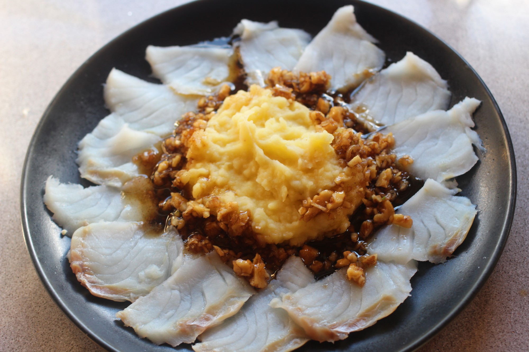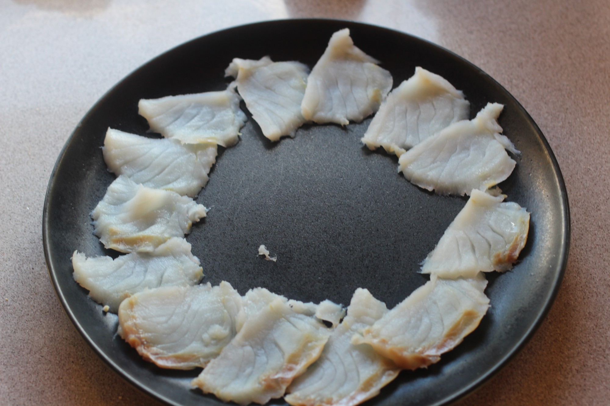 - Torskefileten skjæres i tynne skiver, ca 200 gram per porsjon, du legger dem i ring på ytterkanten av tallerkenen – som NB: må tåle sterk varme.