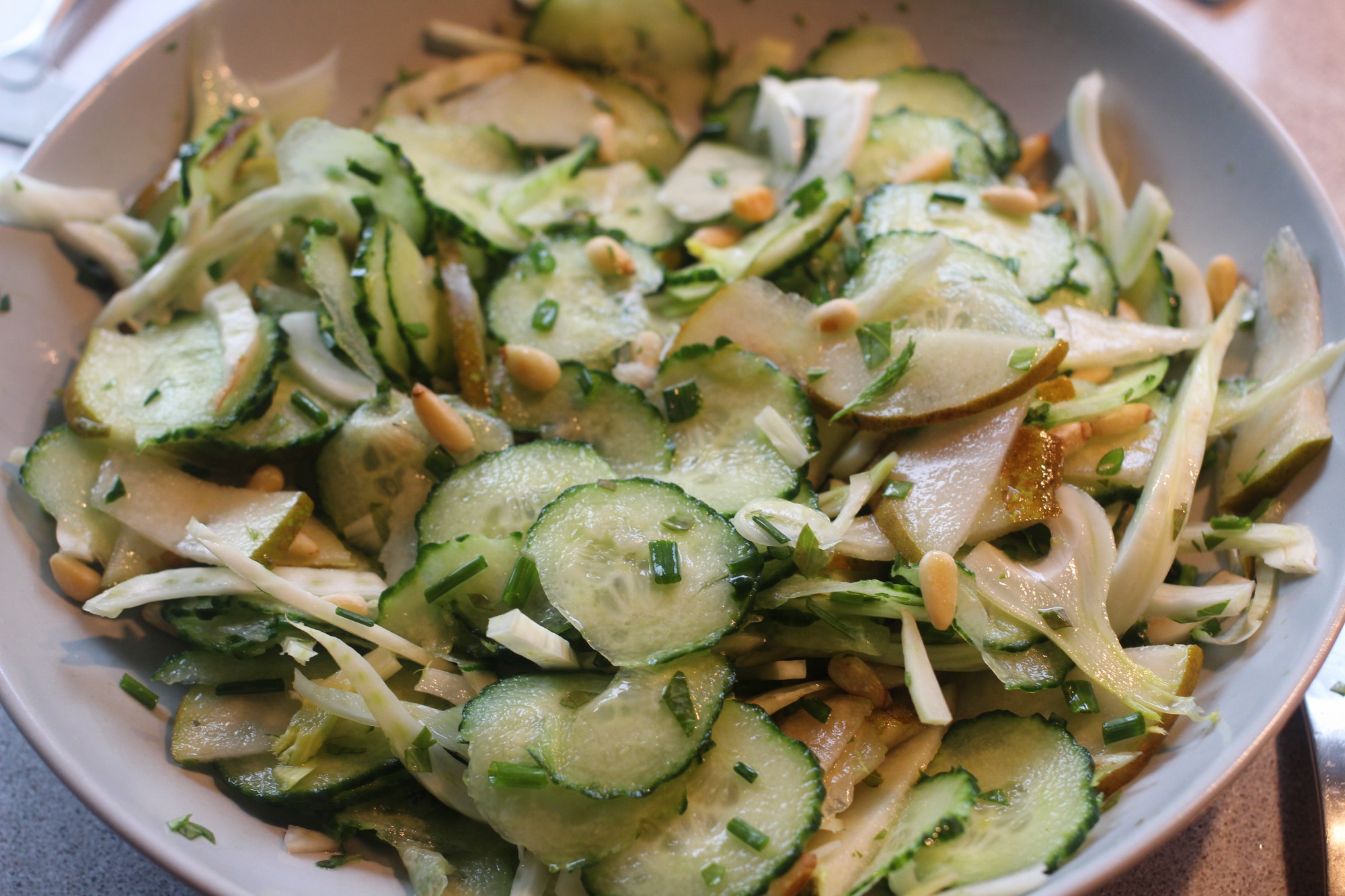 - Gjør så klar salaten, til 3-4 personer: En halv fenikkel skjært i tynne skiver, en halv pære likeså, og en halv agurk med