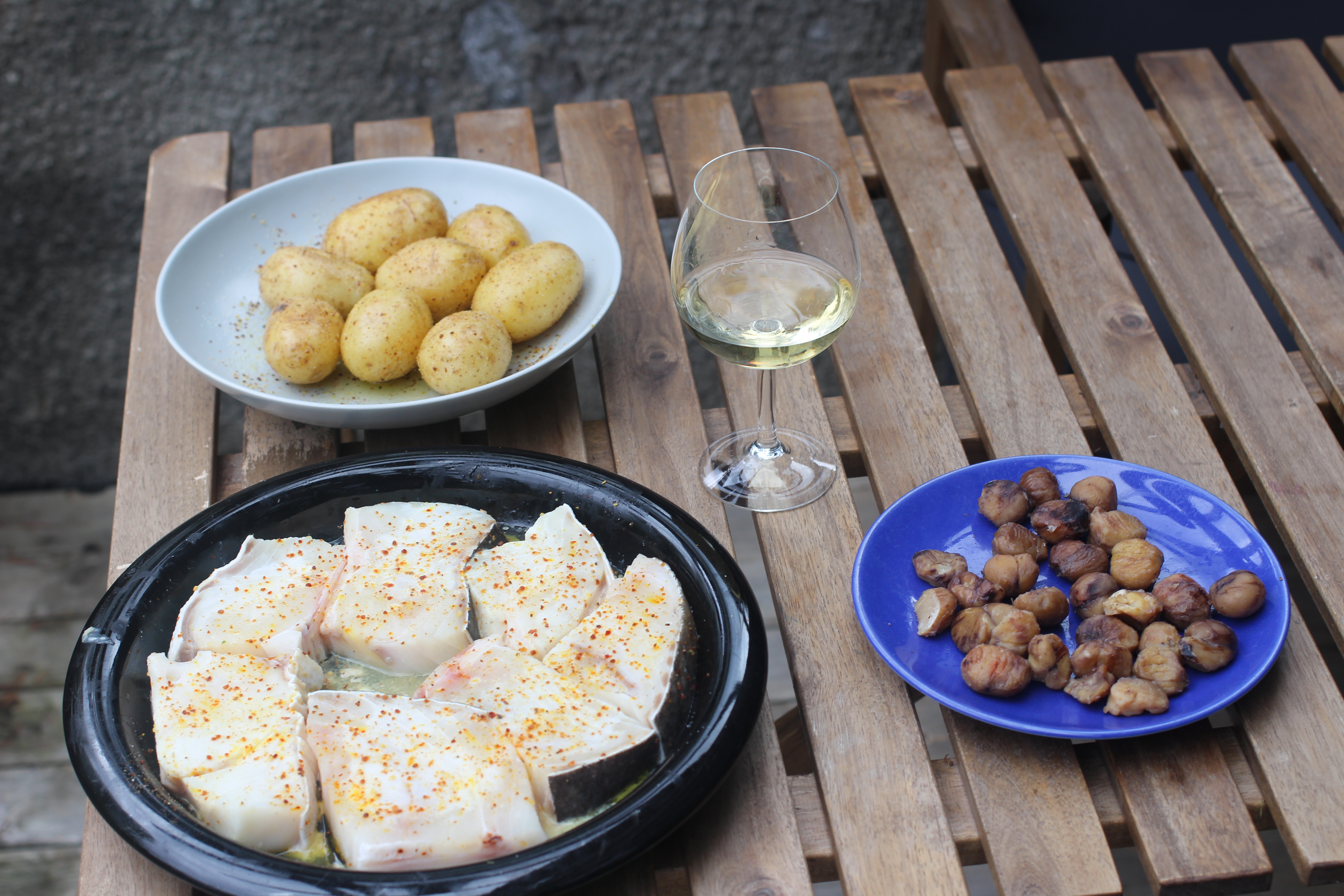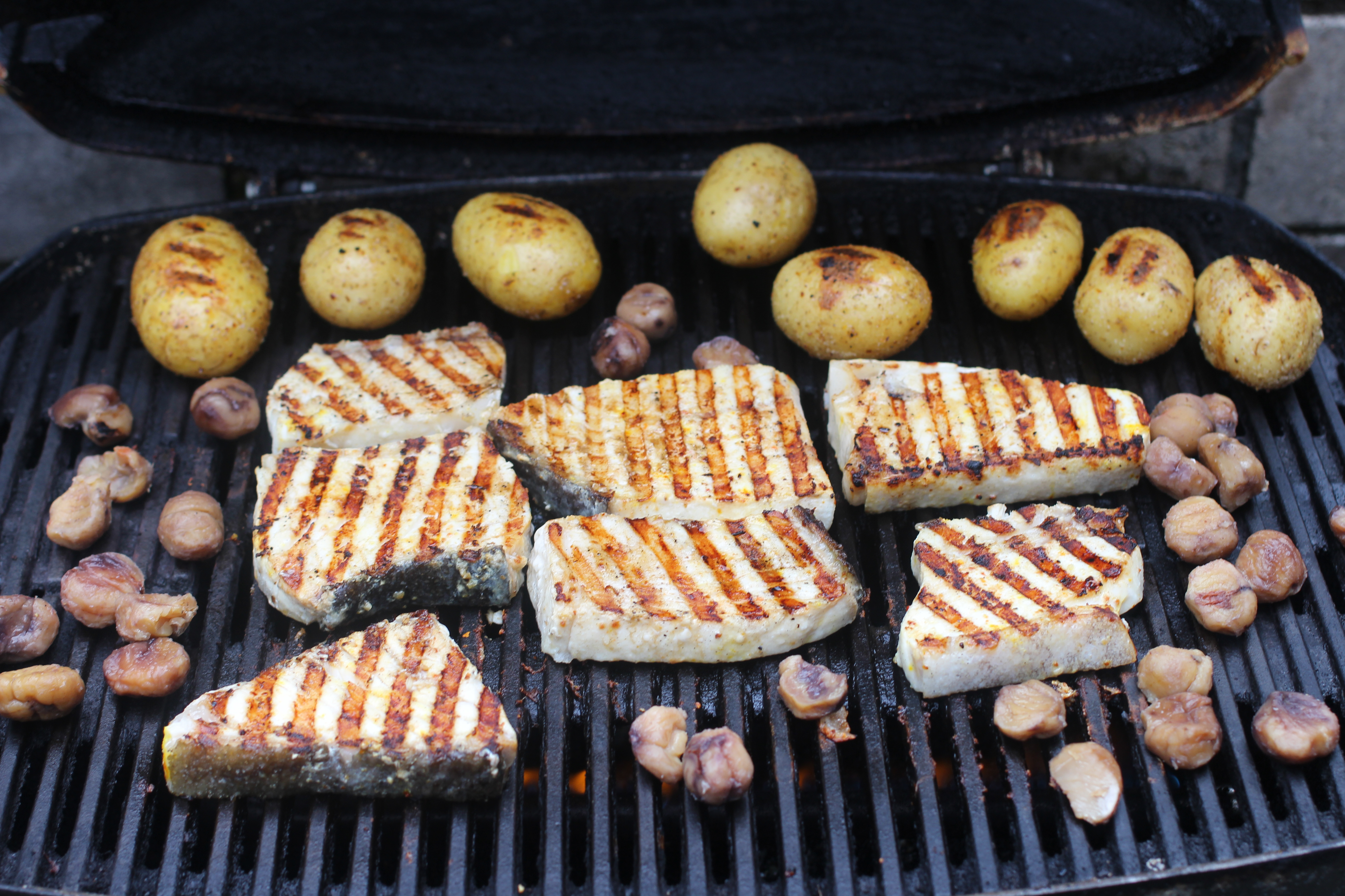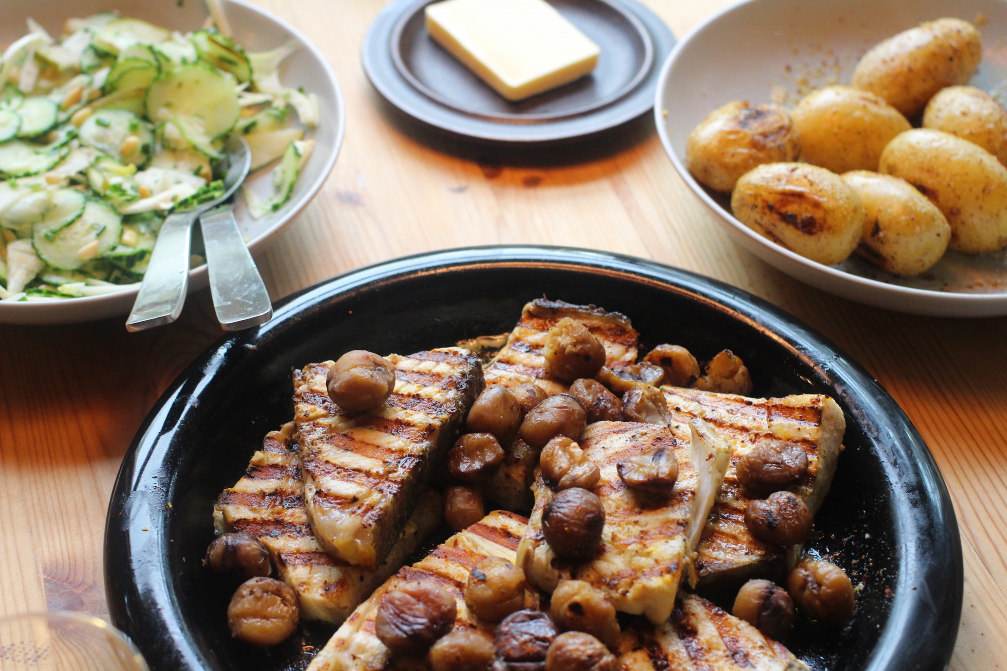 Grillede kastanjer har alltid hørtes flott ut – derfor gjorde jeg et impulskjøp av ferdig kokte kastanjer – de kan bare legges på grillen noen minutter så funker det. Kveiteskiver egner seg også fint på