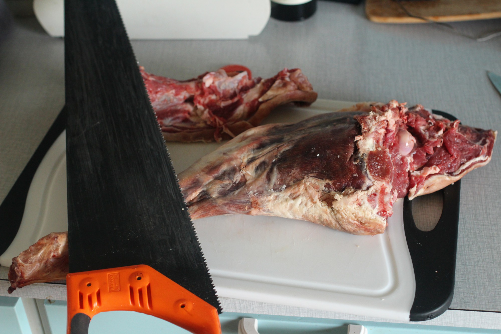 Første jobb er å skjære ut isbeinet på låret, la kniven følge beinet langs alle krinkler til du kommer til kuleleddet – hvor du må bruke litt makt for å kutte sener, lirk isbeinet ut. Så sages nedre del av skanken av. Dette er både for å få et mindre og mer håndterlig lår på grillen og for å koke kraft på beina: