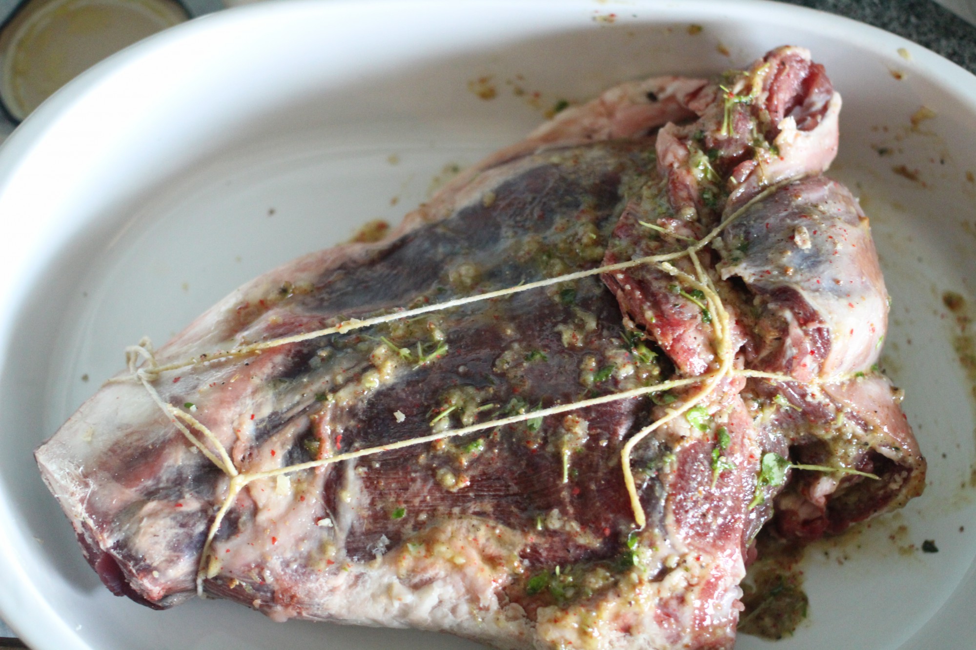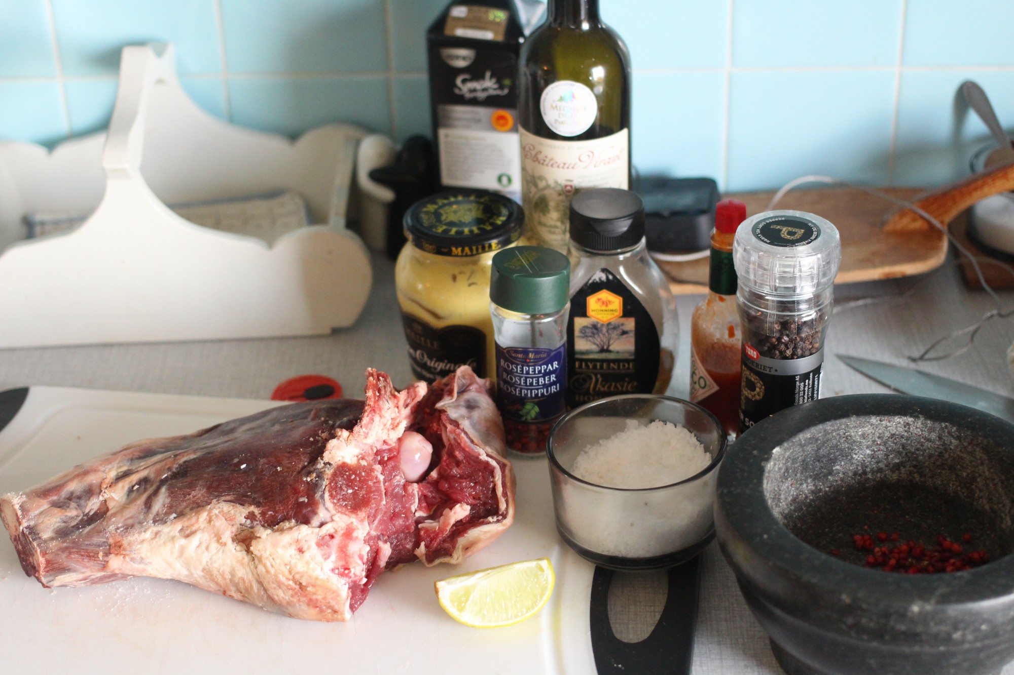 mindre rosepepper, 1-2 ts grov salt, 3-4 hvitløksfedd og en ss eller to med frisk hakket oregano (eller annet grønt etter smak), raspet sitronskall fra 1/4 sitron. Knus alt godt med morteren. Så blander du inn det våte: En ss dionsennep, en god ts honning, 2 ss olivenolje og safta fra den kvarte sitronen. Smør inn låret godt, også der du har skjært ut isbeinet.