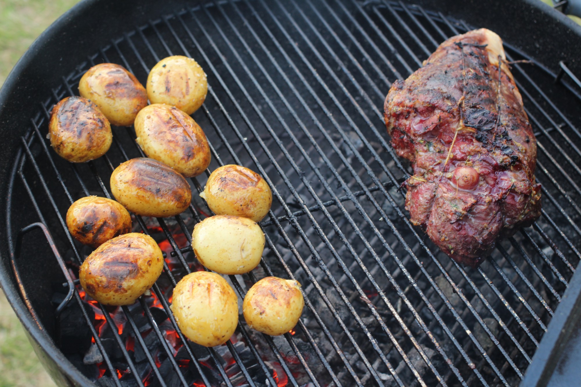 flaksalt og noen drag med pepperkverna. Så blir de med i grillen sammen med låret på sluten – 10-15 minutt – poteten tar den ledige plassen over kullet og fortsetter mens låret hviler 10-15 min.