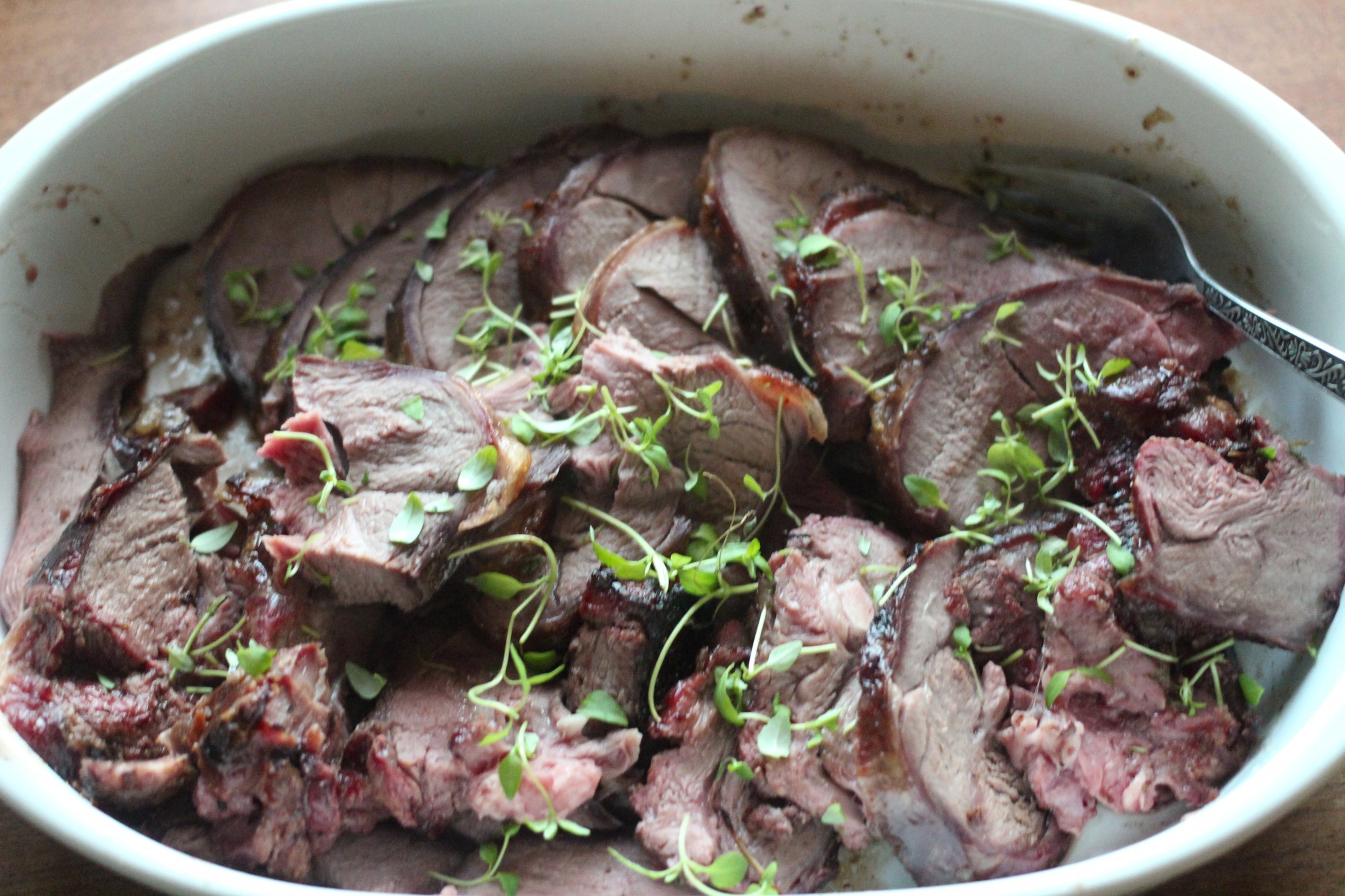 I Åfjord sentrum er det i tillegg til et mini-pol også et misunnelsesverdig mini-fiskeutsalg, som også har lokale kjøttvarer. Her fant vi lammelår av villsau fra Hardbak i ulike størrelser, det fristet selvsagt. Siden vi denne kvelden bare var fire passet det fint med et lite lår på 1,5 kg, seinere i uka var vi flere til bords – og da gjentok vi med ett som var dobbelt så stort. Da ble det en liten rest – og den finner du egen oppskrift på her: Lammelår-rest med grønnsaker i form på grillen.