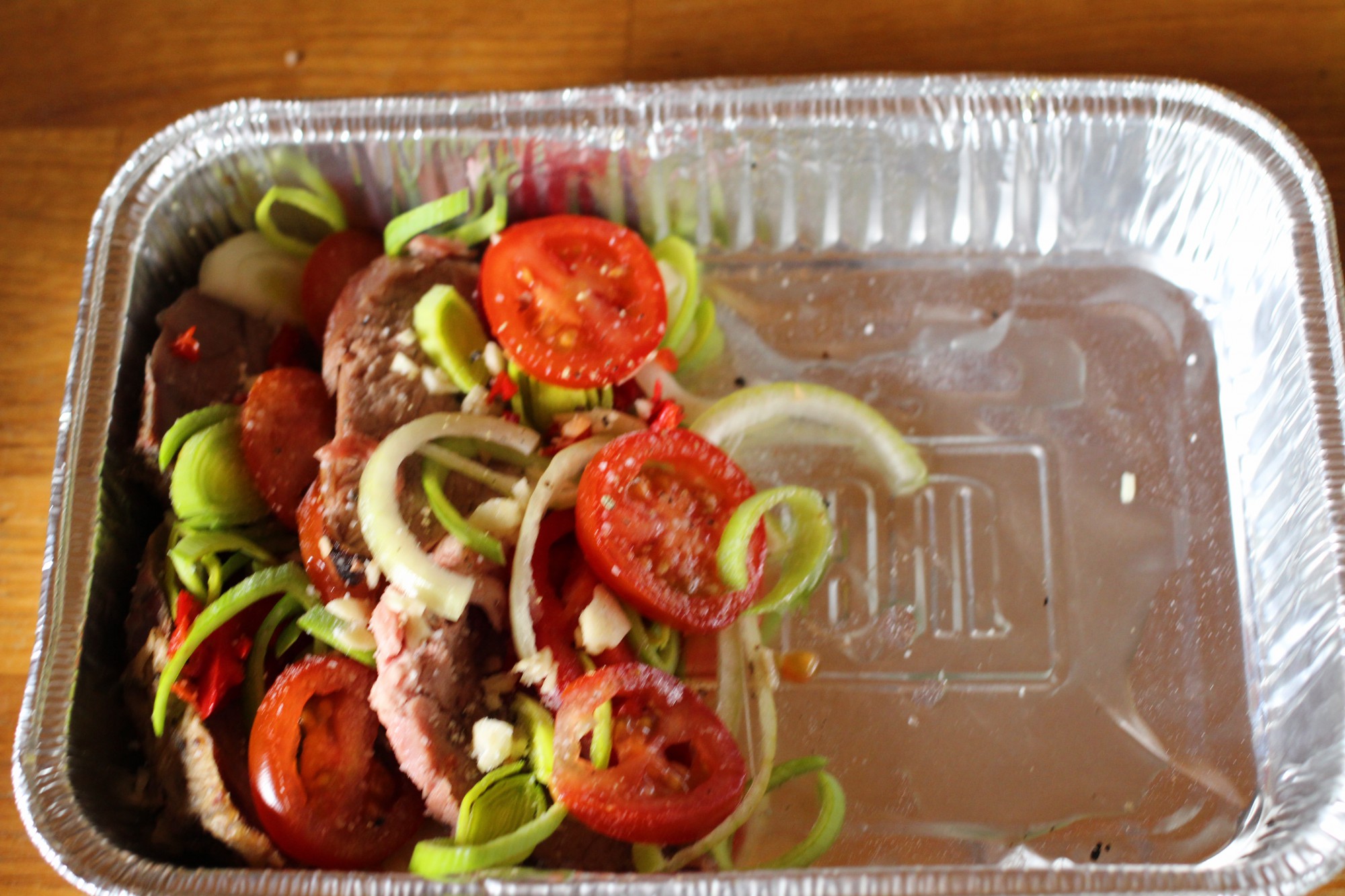 - Bruk ei grillform i aluminium med litt olje i bunnen, legg kjøttskivene og grønnsakene lagvis på langs av formen, strø hvitløk og chili imellom sammen med noen drag med saltkverna.