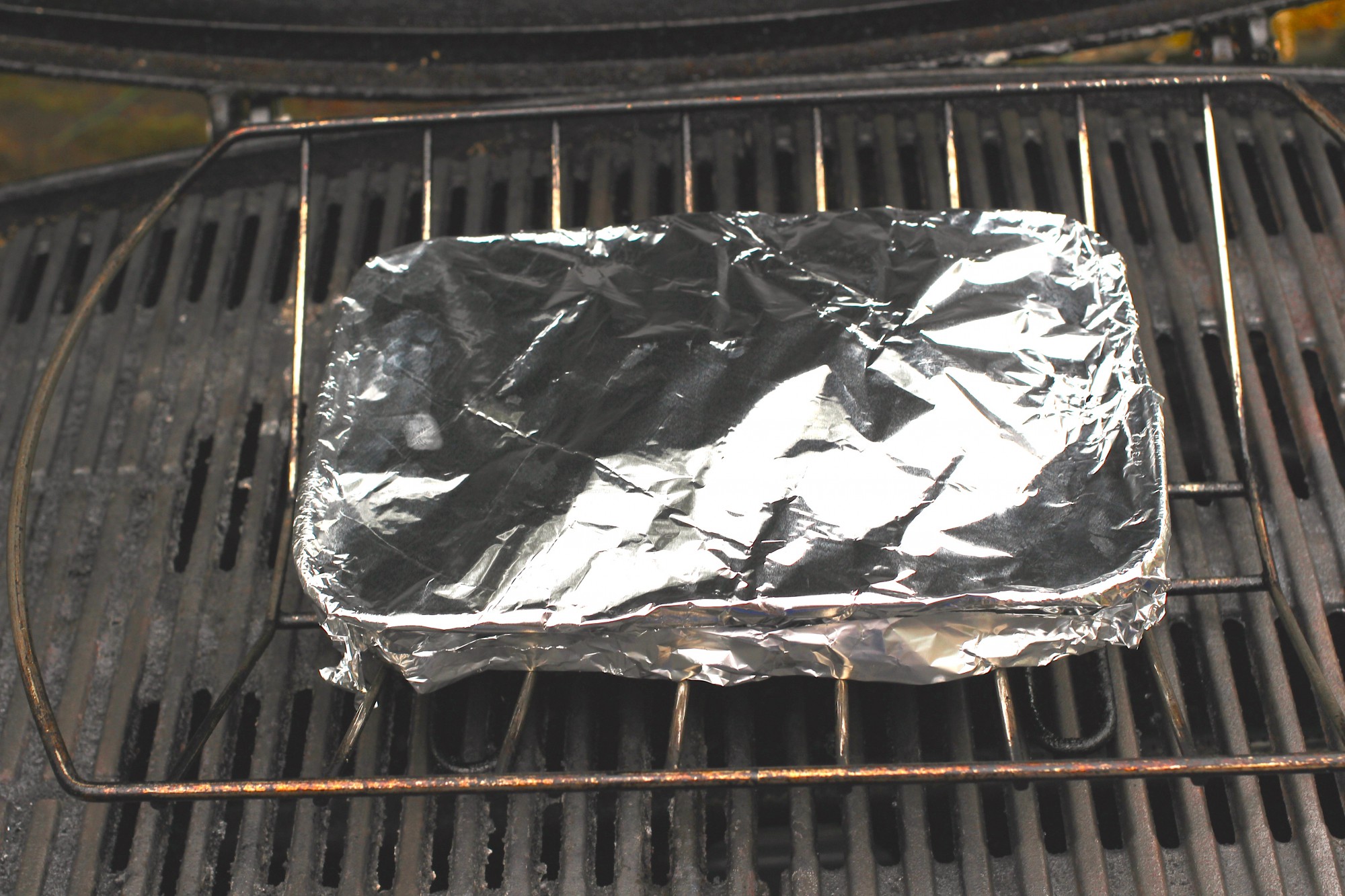 tynne skiver smør og noe grønt – her har jeg basilikumblader. Tett på toppen med aluminiumsfolie. - Sørg for at grillen er ca 150-180 grader og la forma stå en halvtime i indirekte varme, her har jeg hevet opp forma fra grillrista med et stativ og med